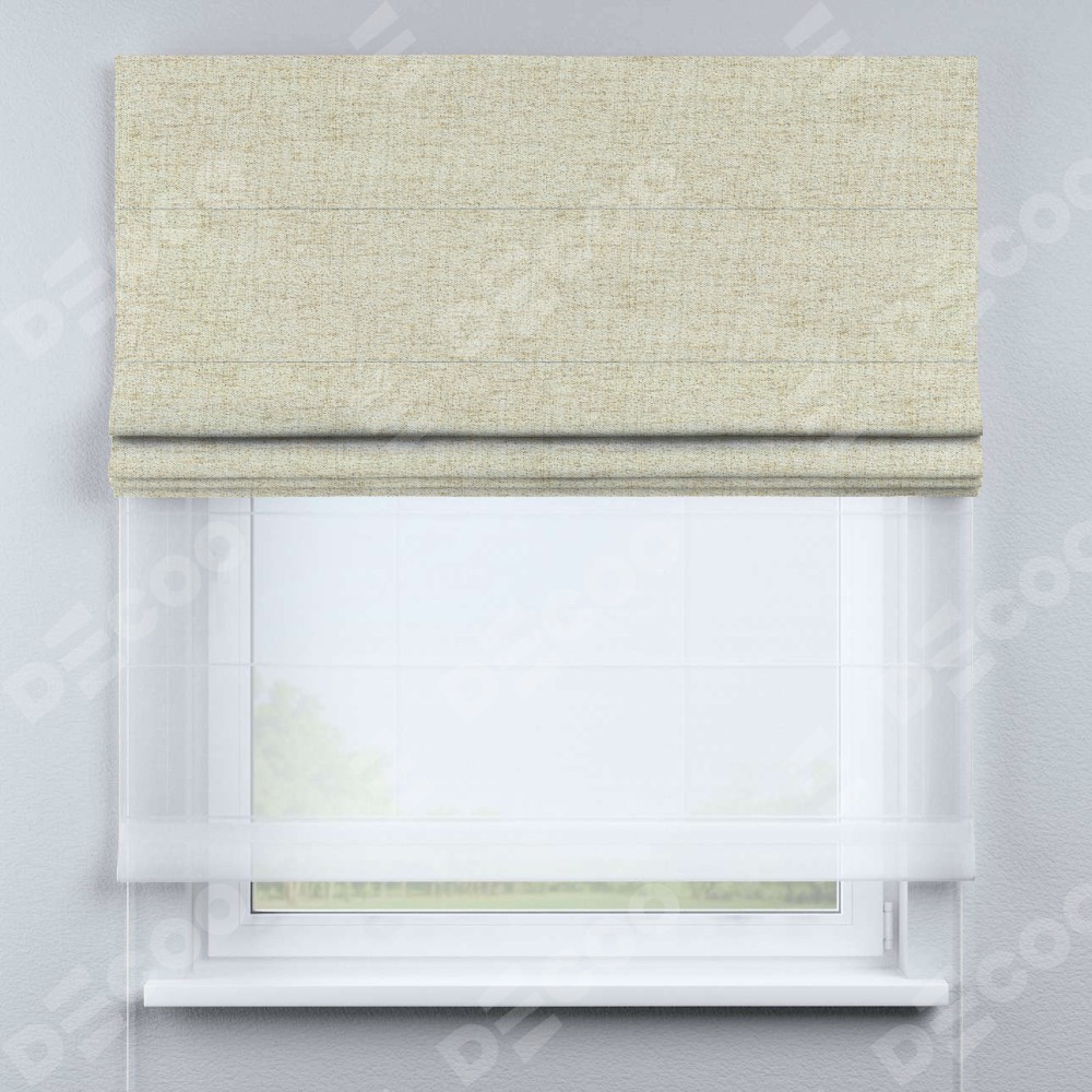 Двойная римская штора «День-ночь» от производителя Cortin предназначена для использования в проёмах. Эта штора уникальна тем, что состоит из двух полотен. На лицевой стороне находится рогожка димаут золотой песок (артикул: 91015), обеспечивающий эффективное затемнение. В комплект также входит вторая ткань — легкий белый тюль (артикул: V-01), который добавляет изящества и легкости оформлению окна. Кроме того, доступны и другие разновидности ткани тюль, выбор которых доступен по ссылке .