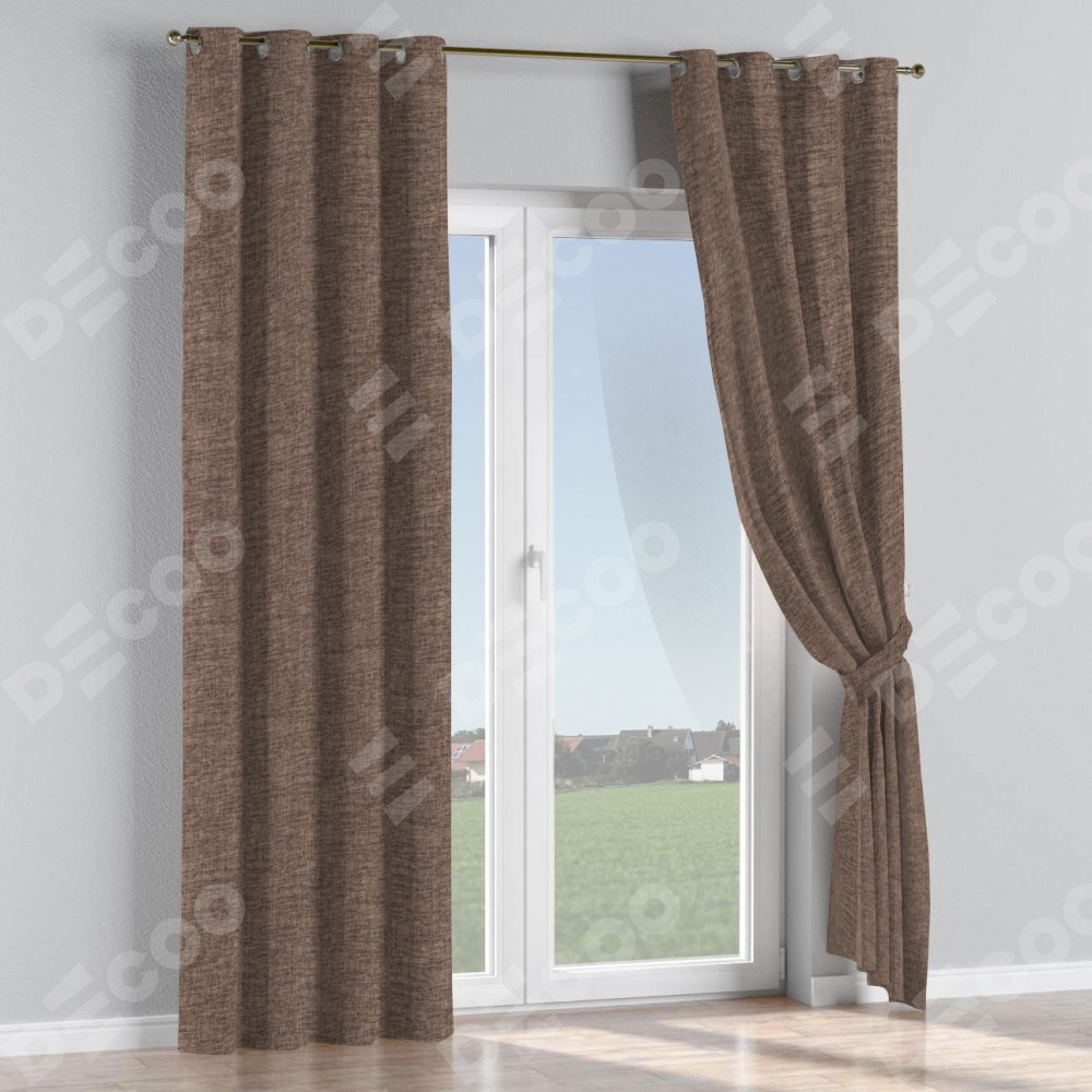 Комплект прямых штор, от производителя «Cortin», пошиты из ткани рогожка димаут коричневый, артикул ткани 91018. Данная модель пошита на люверсах, комплектуется на выбор круглым карнизом и подходит для монтажа на стену или потолок. Прямые шторы на люверсах шьются по стандарту с коэффициентом 1/2 (на 100 см. ширины проёма 200 см. ширины ткани), отличительным преимуществом данной модели является простой способ монтажа. Достаточно повесить ее на трубу и штора готова!