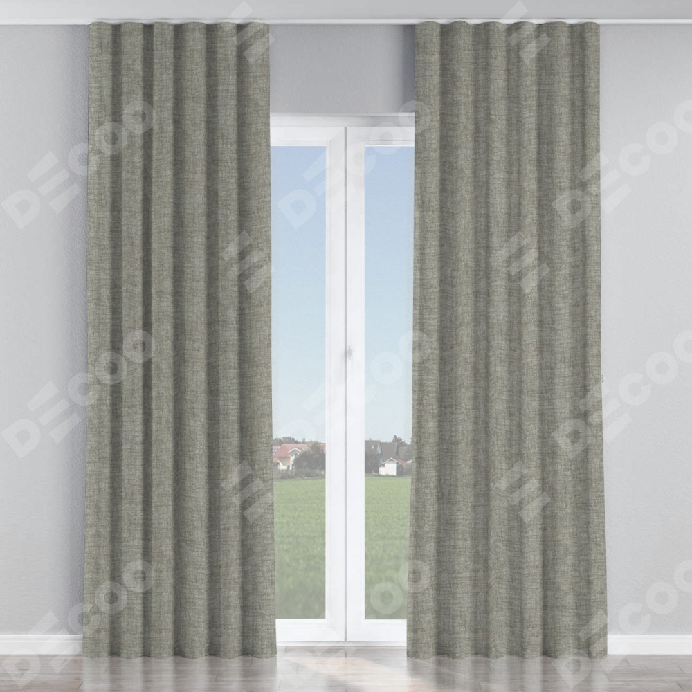 Комплект прямых штор, от производителя «Cortin», пошиты из ткани рогожка димаут серый дуб, артикул ткани 91028. С изнаночной стороны в верхней части штор пристрачивается шторная лента с декоративными складками «Волна». Для создания элегантных складок прямые шторы шьются по стандарту с коэффициентом 1:2 (на 100 см. ширины проёма 200 см. ширины ткани).
