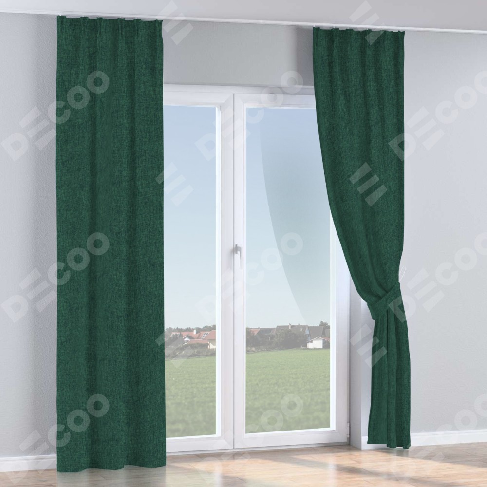 Комплект прямых штор, от производителя «Cortin», пошиты из ткани рогожка димаут тёмно-зелёный, артикул ткани 91022. С изнаночной стороны в верхней части штор пристрачивается шторная лента с декоративными складками «Кустик». Для создания элегантных складок прямые шторы шьются по стандарту с коэффициентом 1:2 (на 100 см. ширины проёма 200 см. ширины ткани).