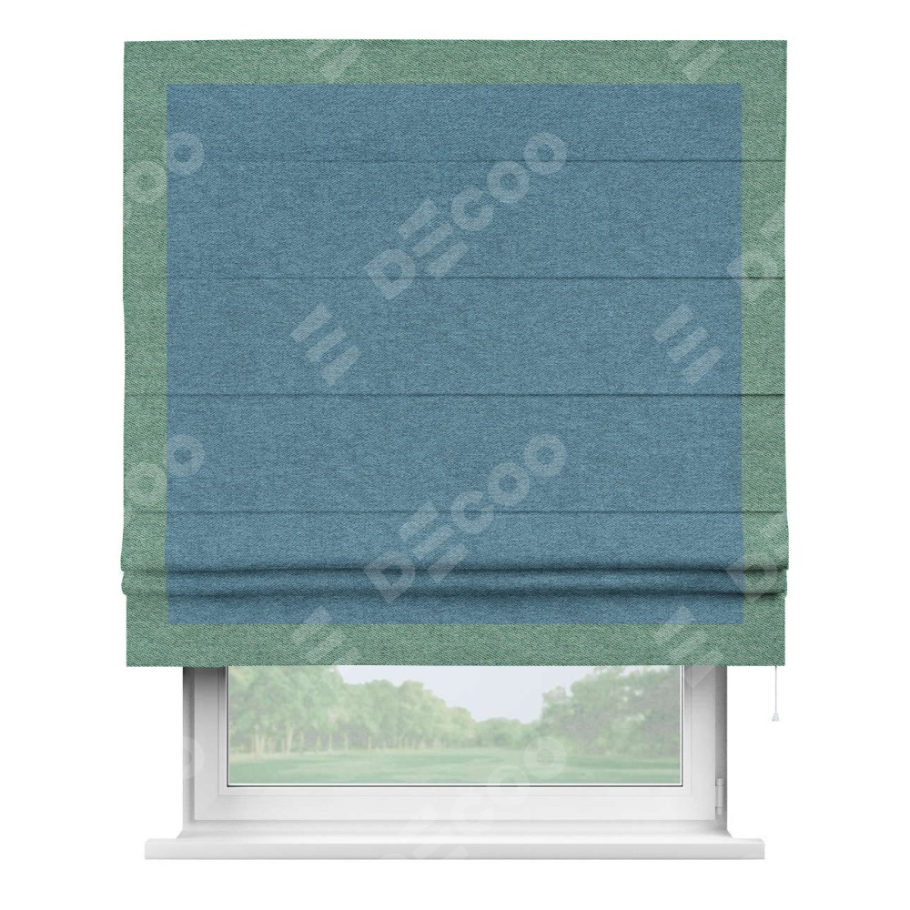 Римская штора пошита из ткани твид блэкаут светло-синий, артикул: 90935, с отделкой кантом «Чесс» отличается своей уникальной деталью — наличием канта не только по бокам и снизу, но и сверху по всем краям шторы. Это придает шторе особенно аккуратный и завершенный вид, делая акцент на границах и форме шторы. Отделка кантом по всему периметру шторы усиливает её декоративные качества и подчеркивает строгую геометрию, что может быть особенно актуально для современных и минималистичных интерьеров.