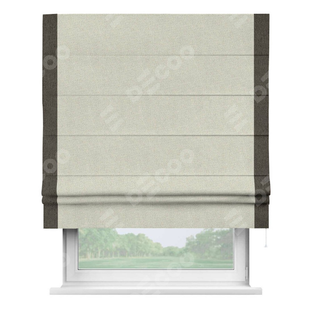 Римская штора пошита из ткани твид блэкаут шампань, артикул: 90929, с отделкой кантом «Стрим Дуо» выделяется наличием кантов по обоим бокам шторы, слева и справа. Этот дизайн придает шторе аккуратный и завершенный вид, акцентируя вертикальные линии и визуально вытягивая окно в высоту. Отделка кантом по бокам не только украшает штору, но и служит практической функцией, укрепляя края и продлевая срок службы изделия.