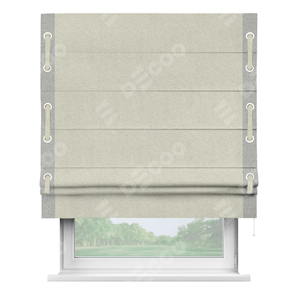 Римская штора пошита из ткани твид блэкаут шампань, артикул: 90929, с отделкой кантом «Стрим Дуо», дополненная декоративными люверсами на этих кантах и протянутым пояском из основного цвета римской шторы, представляет собой высоко декоративное и функциональное решение для оконного оформления. Канты, расположенные по обеим боковым сторонам шторы, уже добавляют изысканности и завершенности внешнему виду. Добавление люверсов и пояска не только усиливает декоративный эффект, но и придает шторе дополнительную текстурность и глубину.