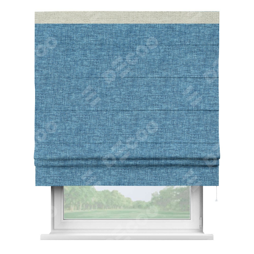 Римская штора пошита из ткани рогожка димаут джинс, артикул: 91026, с отделкой кантом «Кинг» отличается своей необычной особенностью: кант располагается исключительно сверху шторы. Такой дизайн делает акцент на верхней части окна, визуально поднимая потолок и придавая интерьеру более возвышенный и изысканный вид. Отделка кантом на верхней кромке не только украшает штору, но и может служить дополнительной защитой от износа в месте наибольшего контакта с механизмом управления шторой.