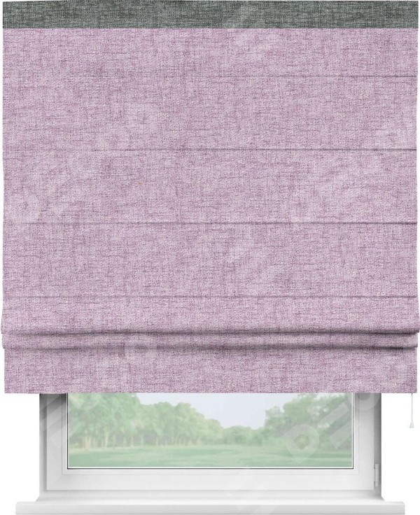 Римская штора пошита из ткани рогожка димаут розовый, артикул: 91031, с отделкой кантом «Кинг» отличается своей необычной особенностью: кант располагается исключительно сверху шторы. Такой дизайн делает акцент на верхней части окна, визуально поднимая потолок и придавая интерьеру более возвышенный и изысканный вид. Отделка кантом на верхней кромке не только украшает штору, но и может служить дополнительной защитой от износа в месте наибольшего контакта с механизмом управления шторой.