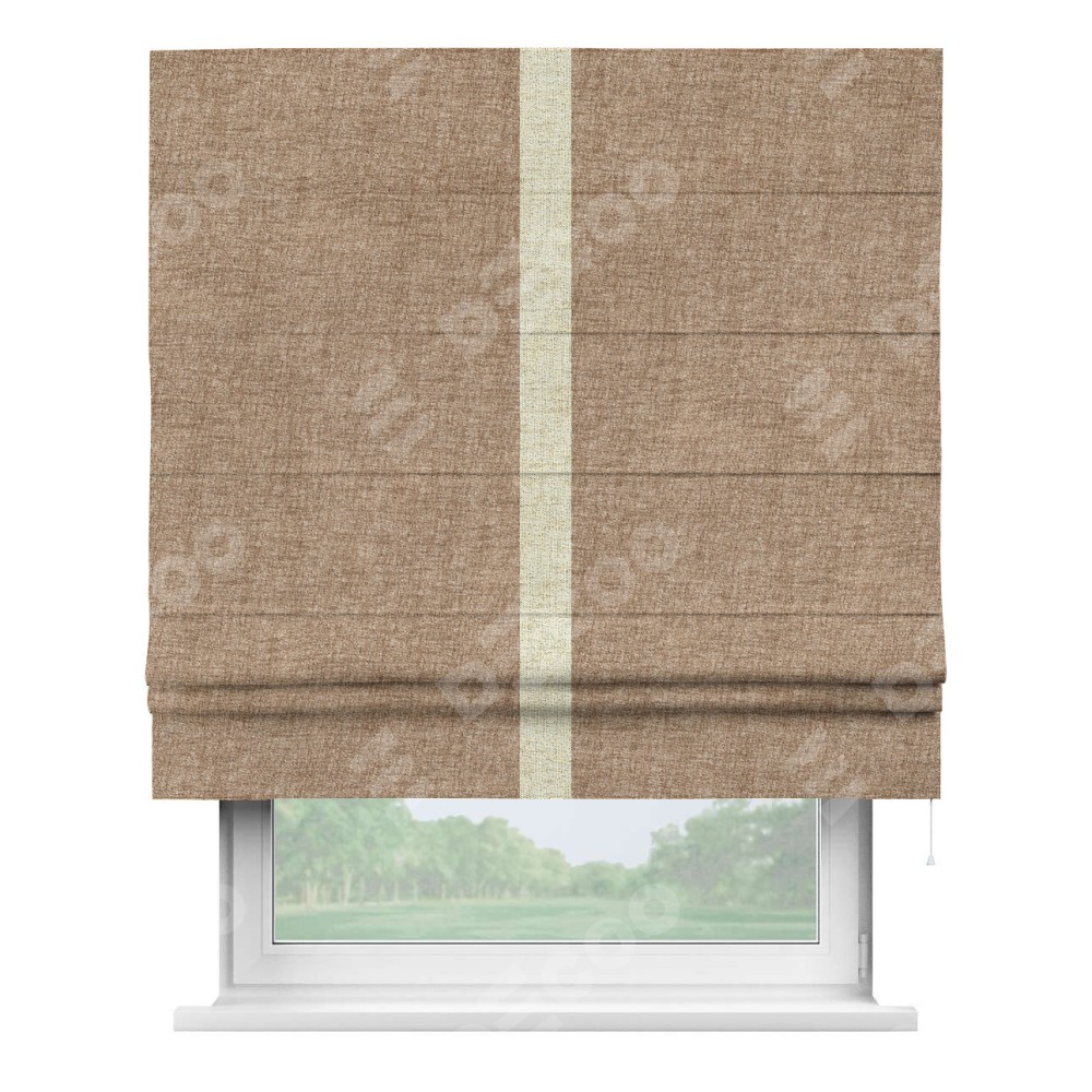 Римская штора пошита из ткани рогожка димаут светло-коричневый, артикул: 91017, с отделкой кантом «Хайвэй» представляет собой уникальное и смелое дизайнерское решение, где кант расположен вертикально посередине шторы. Этот дизайн не только выделяет штору среди других вариантов оформления окон, но и создает интересный визуальный акцент, привлекая внимание к центру окна и разделяя штору на визуальные зоны. Такой нестандартный подход добавляет динамичности интерьеру и может быть использован для подчеркивания особенностей оформления помещения.