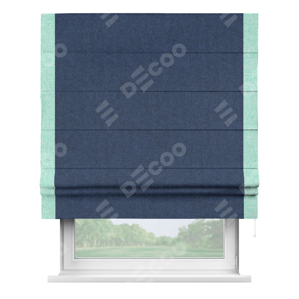 Римская штора пошита из ткани лён кашемир тёмно-синий, артикул: 17215, с отделкой кантом «Стрим Дуо» выделяется наличием кантов по обоим бокам шторы, слева и справа. Этот дизайн придает шторе аккуратный и завершенный вид, акцентируя вертикальные линии и визуально вытягивая окно в высоту. Отделка кантом по бокам не только украшает штору, но и служит практической функцией, укрепляя края и продлевая срок службы изделия.