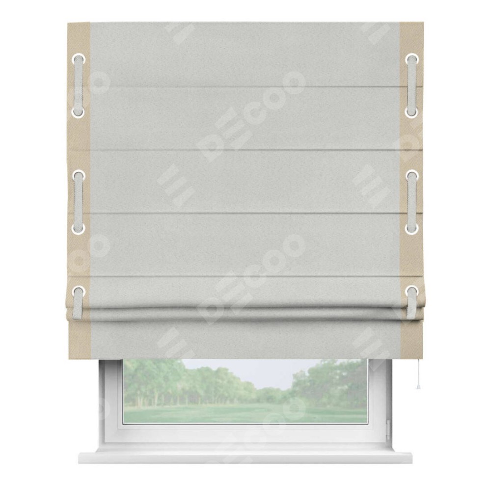 Декоративные люверсы на кантах могут выполнять как чисто украшательную функцию, так и быть частью механизма для протягивания декоративного пояска, что добавляет изделию уникальности и игривости. Поясок из основного цвета римской шторы, протянутый через люверсы, не только укрепляет вертикальную композицию, но и позволяет создавать различные драпировки, регулируя внешний вид шторы по желанию.