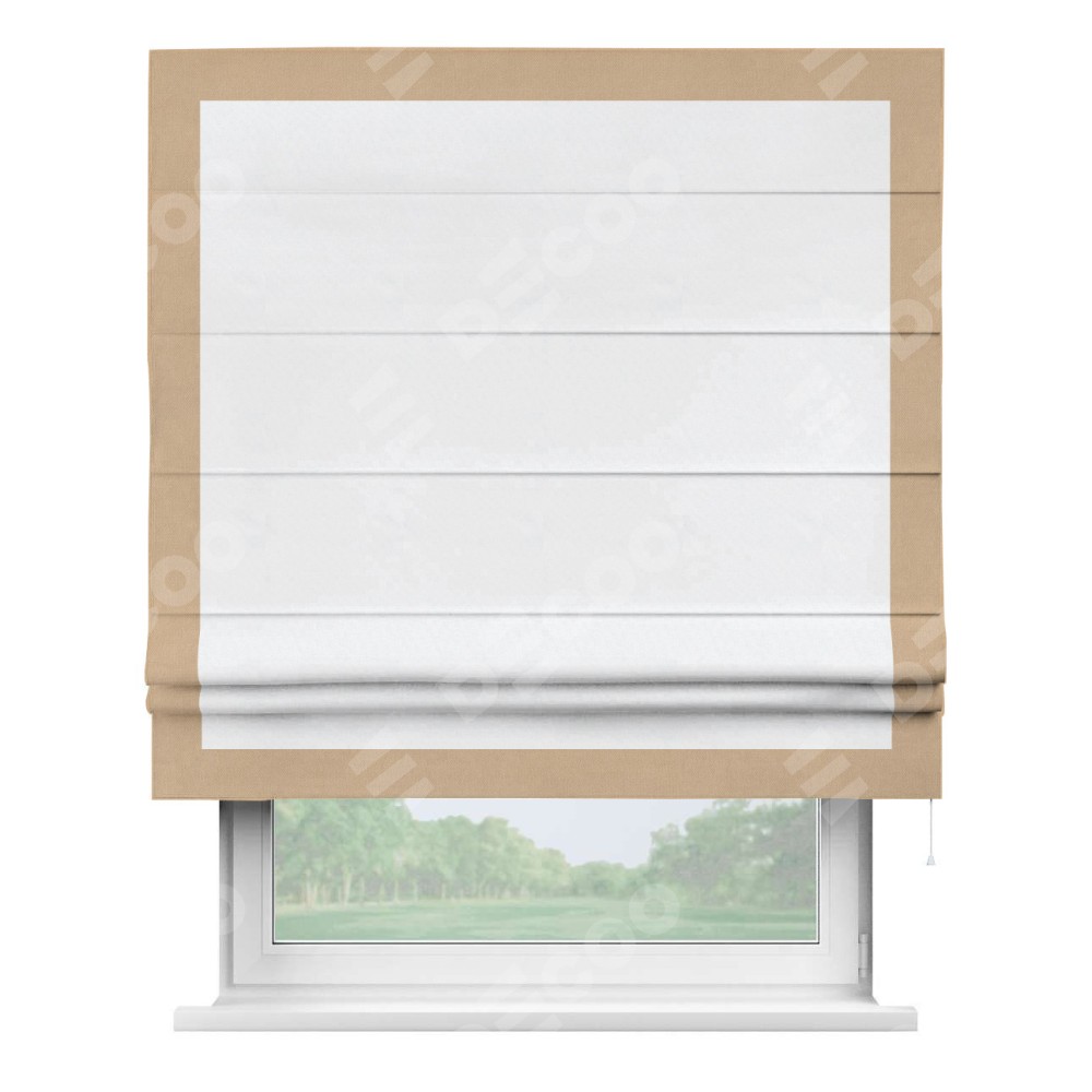 Римская штора пошита из ткани вельвет белоснежный, артикул: 92698, с отделкой кантом «Чесс» отличается своей уникальной деталью — наличием канта не только по бокам и снизу, но и сверху по всем краям шторы. Это придает шторе особенно аккуратный и завершенный вид, делая акцент на границах и форме шторы. Отделка кантом по всему периметру шторы усиливает её декоративные качества и подчеркивает строгую геометрию, что может быть особенно актуально для современных и минималистичных интерьеров.