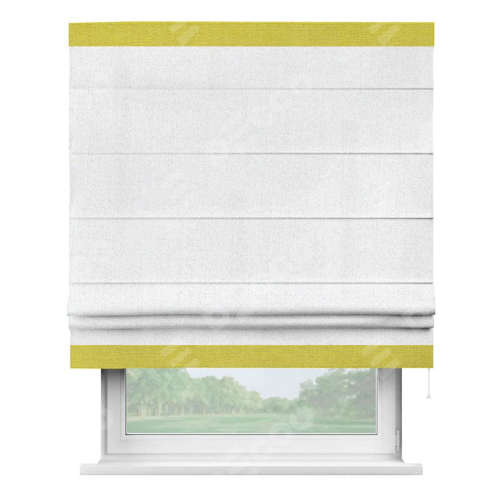 Римская штора пошита из ткани лён белоснежный, артикул: 95632, с отделкой кантом «Горизонт» предлагает уникальное дизайнерское решение, при котором кант располагается только вверху и снизу шторы. Такое решение делает акцент на горизонтальных линиях, визуально расширяя пространство и придавая окну более строгий и организованный вид. Отделка кантом в этих ключевых местах не только украшает штору, но и способствует её долговечности, защищая наиболее уязвимые к износу края.