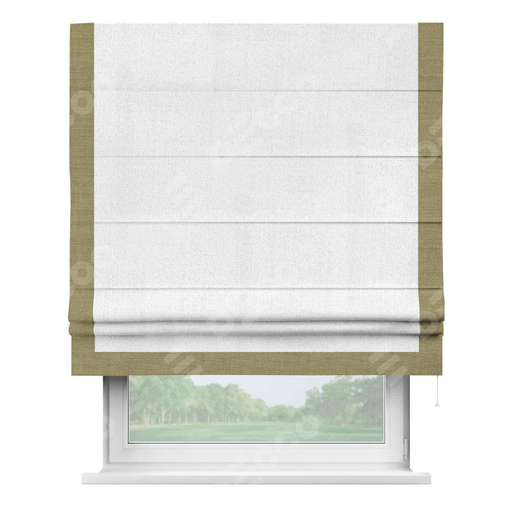 Римская штора с отделкой кантом «Виктория», пошита из ткани лён белоснежный, артикул: 95632. представляет собой элегантное решение для оконного оформления. Кант по бокам и снизу шторы добавляет изысканности и аккуратности внешнему виду, подчеркивая линии и форму шторы. Этот элемент декора не только украшает, но и выполняет практическую функцию, защищая края ткани от износа. Кант может быть выполнен в контрастном или гармонирующем цвете, что позволяет добиться различных стилевых эффектов и легко вписать штору в интерьер комнаты.