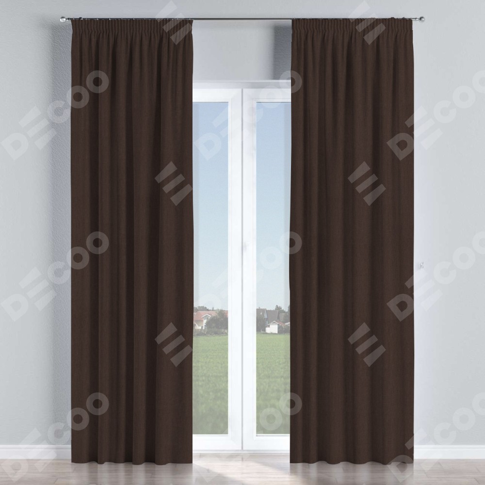 Комплект прямых штор, от производителя «Cortin», пошиты из ткани лён димаут венге, артикул ткани 91001. С изнаночной стороны в верхней части штор пристрачивается шторная лента с декоративными складками «Карандаш». Для создания элегантных складок прямые шторы шьются по стандарту с коэффициентом 1:2 (на 100 см. ширины проёма 200 см. ширины ткани).