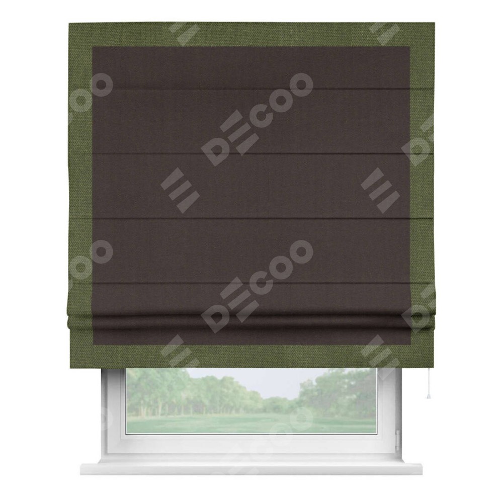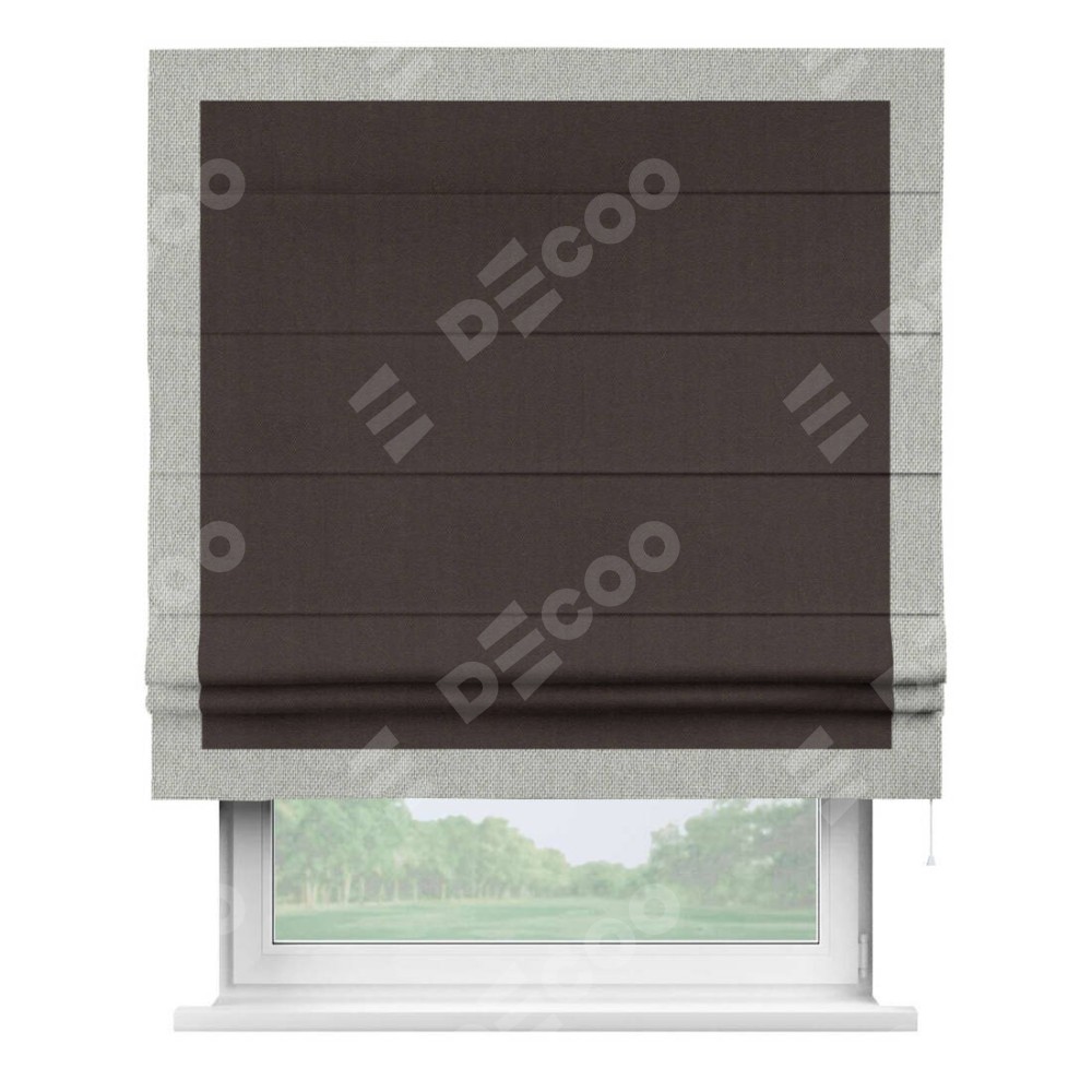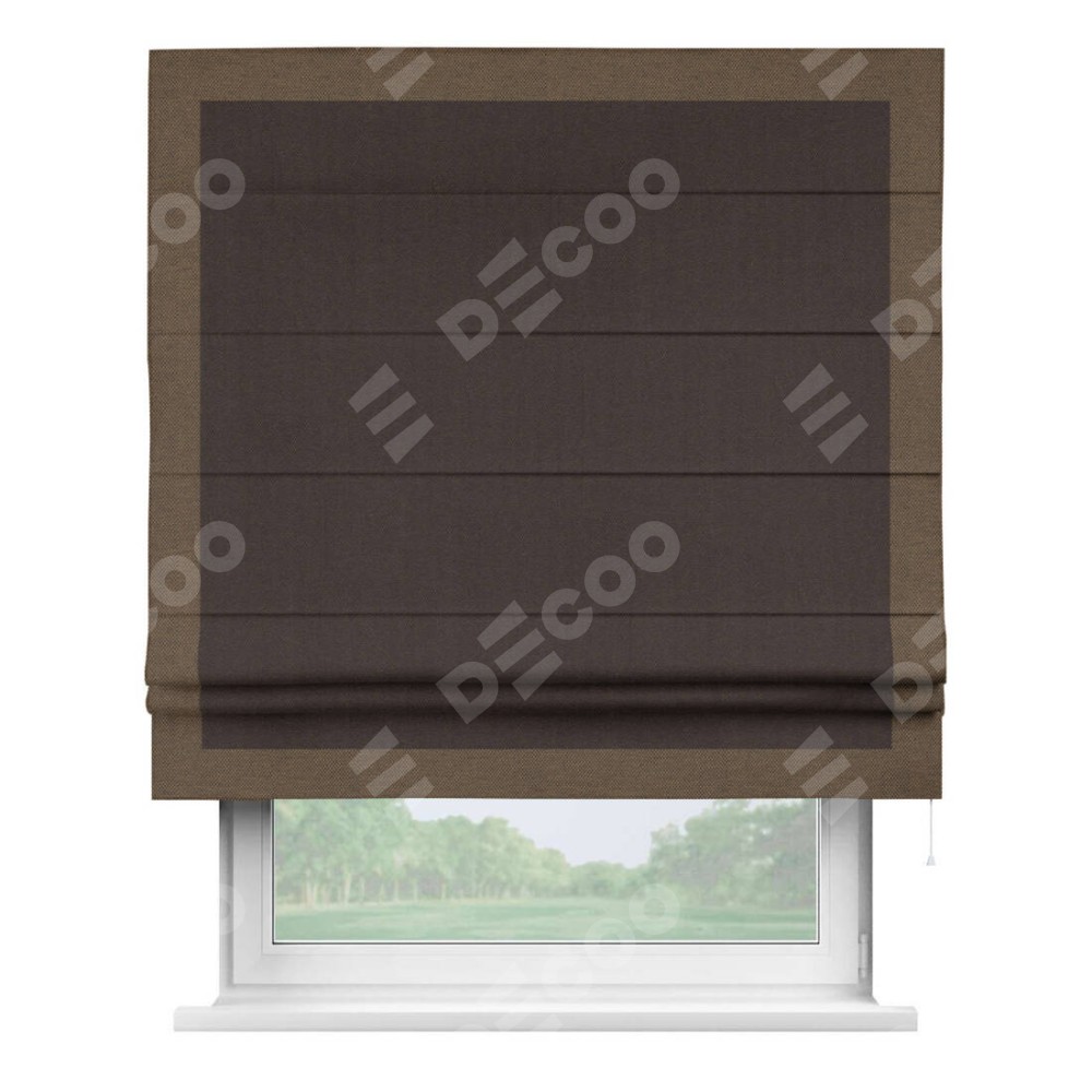 Римская штора пошита из ткани лён димаут венге, артикул: 91001, с отделкой кантом «Чесс» отличается своей уникальной деталью — наличием канта не только по бокам и снизу, но и сверху по всем краям шторы. Это придает шторе особенно аккуратный и завершенный вид, делая акцент на границах и форме шторы. Отделка кантом по всему периметру шторы усиливает её декоративные качества и подчеркивает строгую геометрию, что может быть особенно актуально для современных и минималистичных интерьеров.