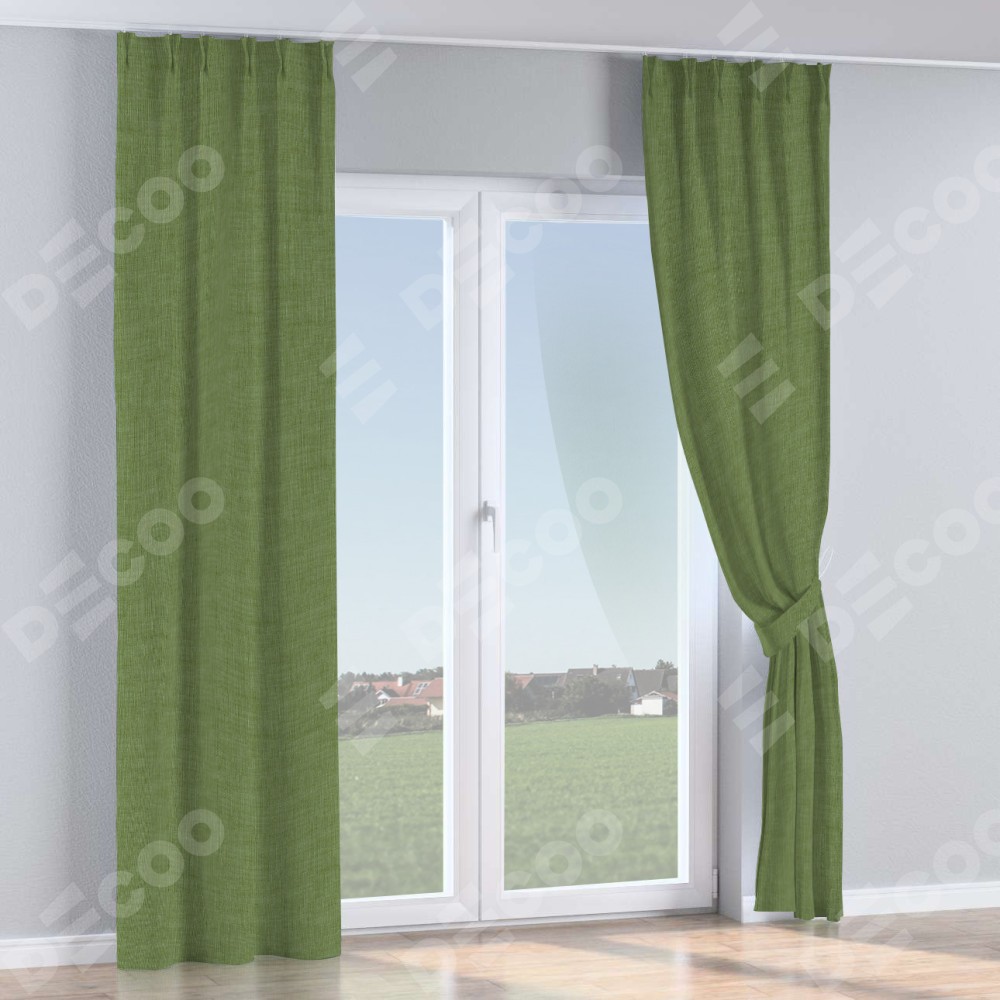 Комплект прямых штор, от производителя «Cortin», пошиты из ткани лён зелёный, артикул ткани 131547. С изнаночной стороны в верхней части штор пристрачивается шторная лента с декоративными складками «Кустик». Для создания элегантных складок рекомендуемый коэффициент 1:2 (на 100 см. ширины проёма 200 см. ширины ткани). Важно! Ширина штор указана без учёта коэффициента сборки!