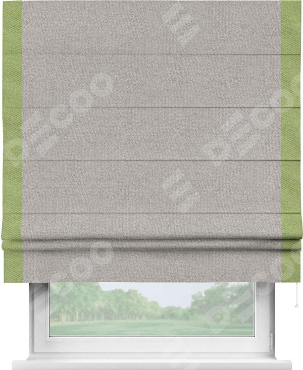 Римская штора «Кортин» для проема, лён димаут серо-бежевый с кантом Стрим Дуо