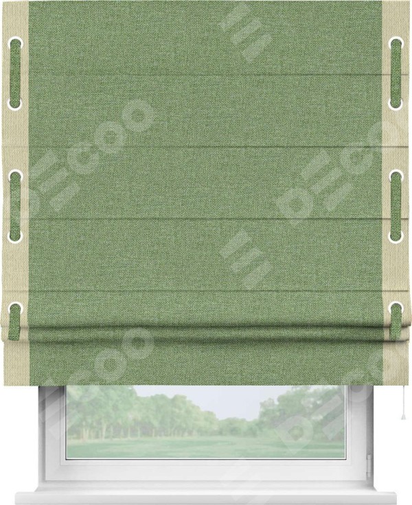 Римская штора «Cortin» для проёма, лён димаут светло-салатовый с кантом Стрим Дуо (люверсы с пояском)