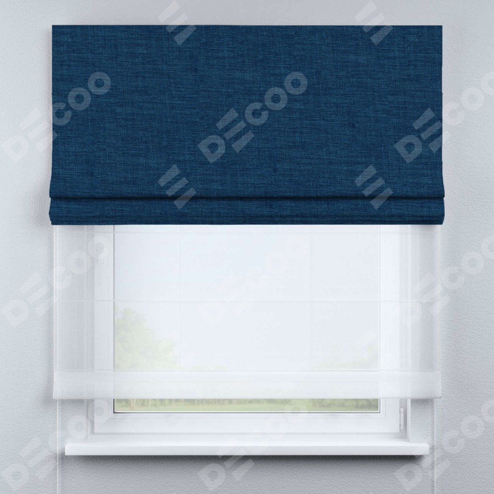 Двойная римская штора «День-ночь» от производителя Cortin предназначена для использования в проёмах. Эта штора уникальна тем, что состоит из двух полотен. На лицевой стороне находится лён синий (артикул: 104496), обеспечивающий эффективное затемнение. В комплект также входит вторая ткань — легкий белый тюль (артикул: V-01), который добавляет изящества и легкости оформлению окна. Кроме того, доступны и другие разновидности ткани тюль, выбор которых доступен по  ссылке .