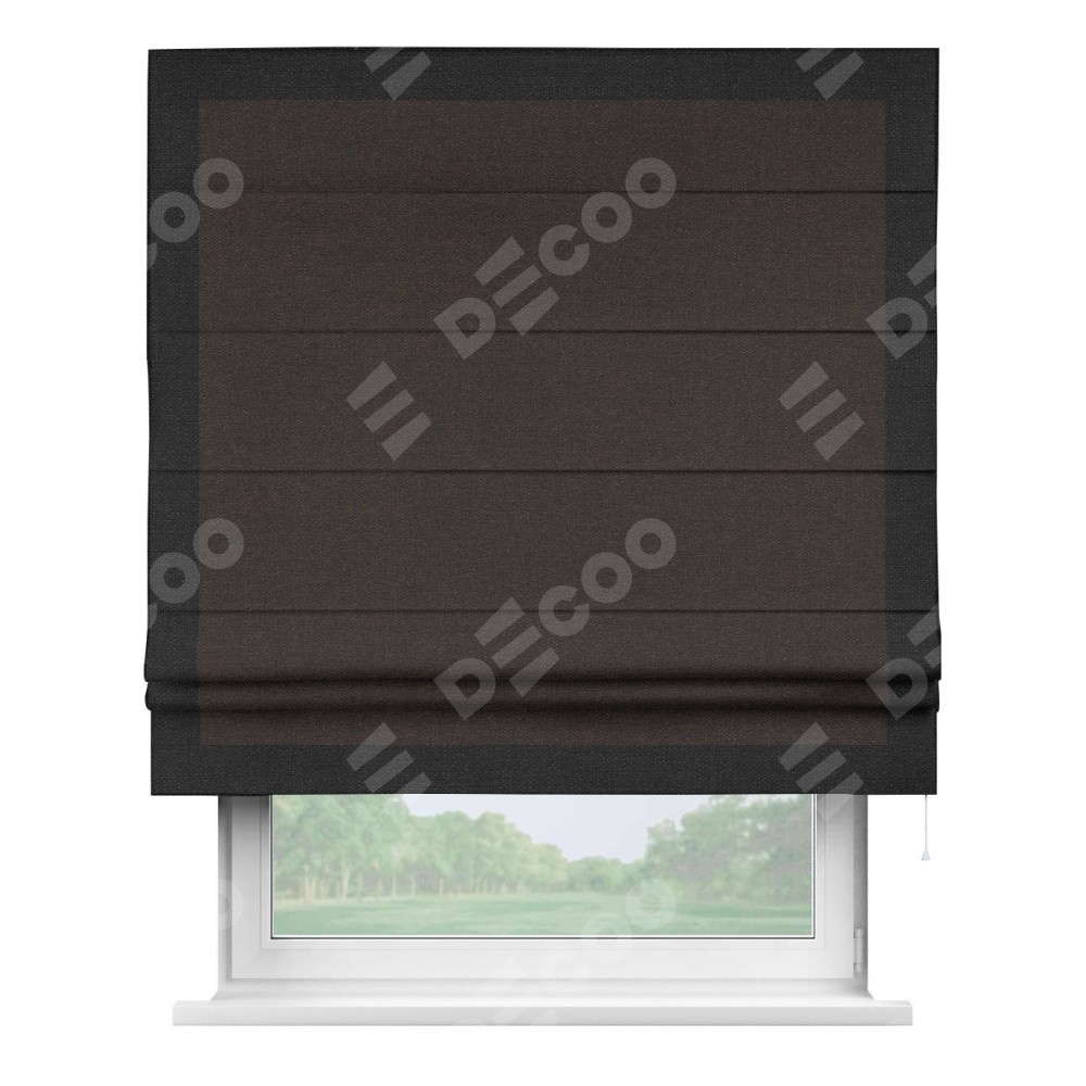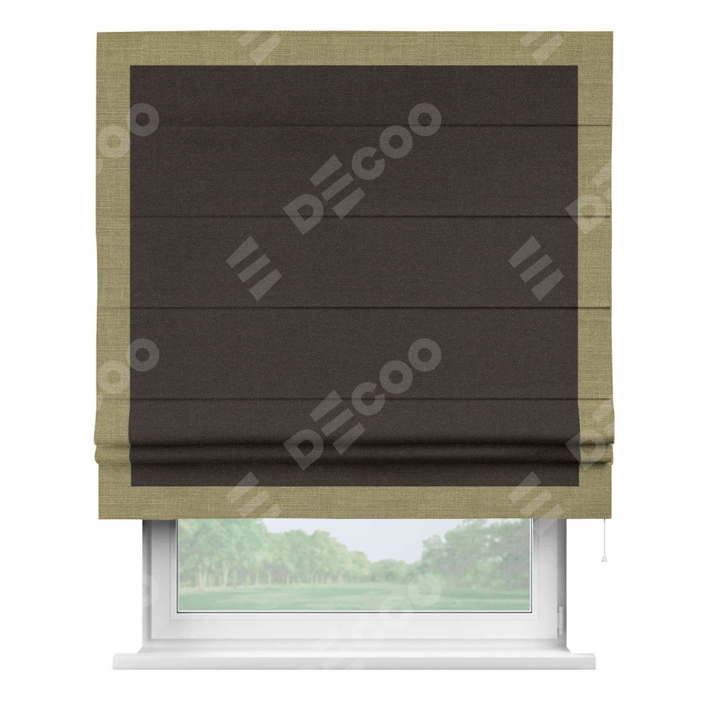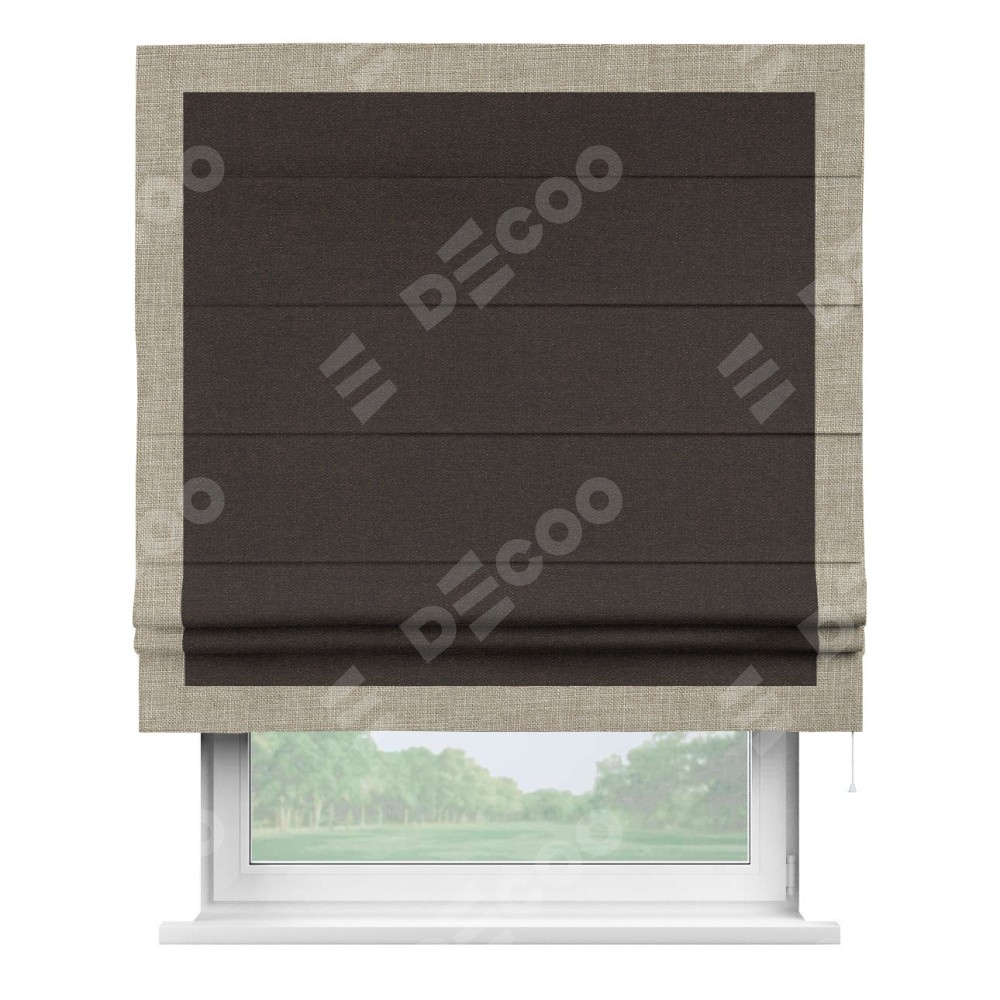 Классическая римская штора производителя «Cortin», пошита из ткани лён тёмно-коричневый, артикул: 104497. Имеет универсальный механизм и подходит для монтажа: на потолок, на стену и в нишу.