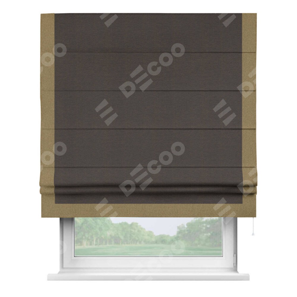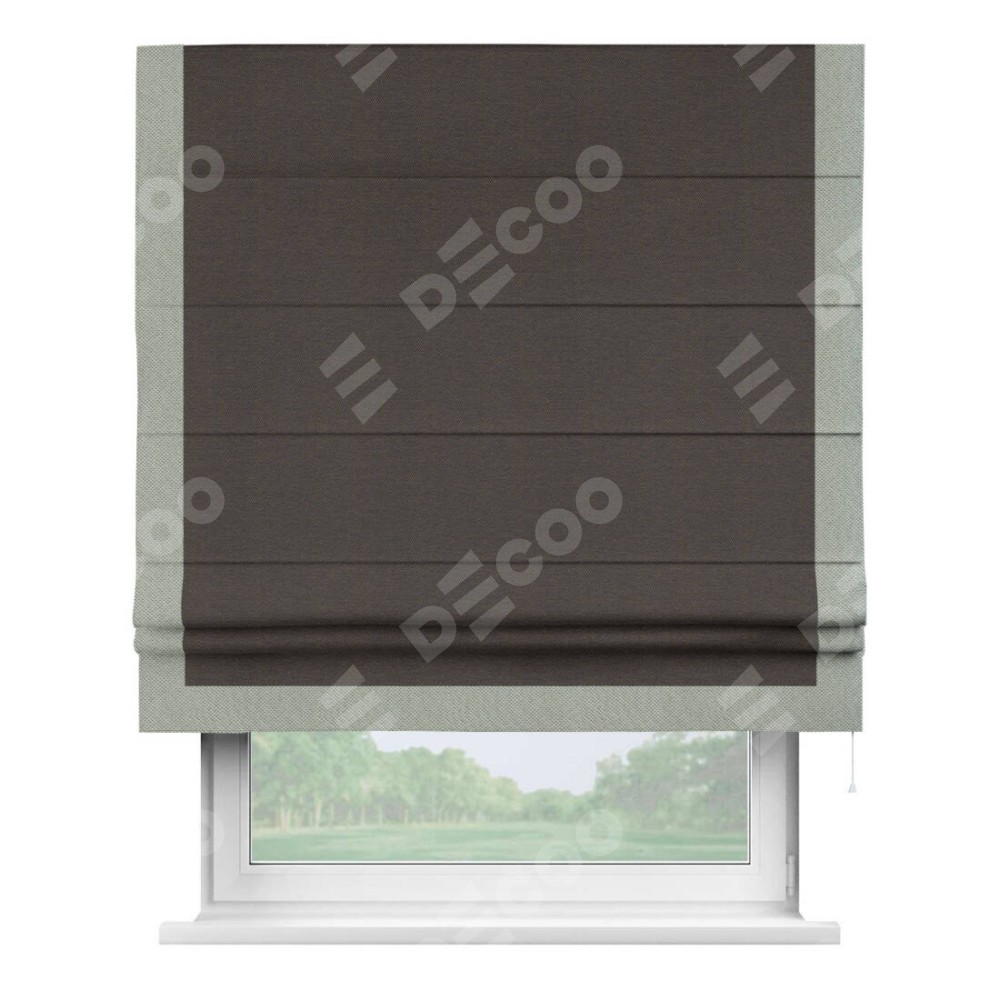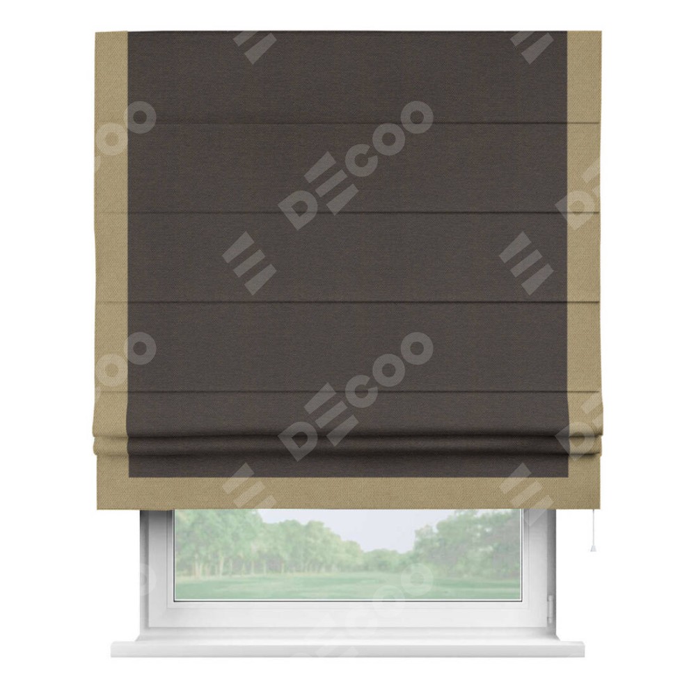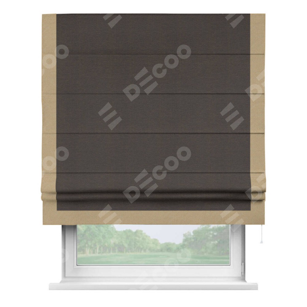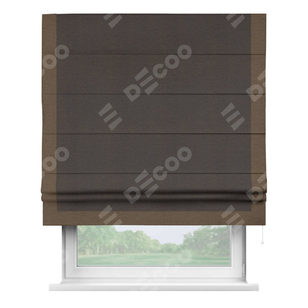 Римская штора производителя «Cortin», используется для проёма, пошита из ткани лён димаут венге, артикул 85410. Отделка шторы кантом «Виктория», ткань для канта используется из льна димаут разной расцветки на выбор. Имеет универсальный механизм и подходит для монтажа: на потолок, на стену и в нишу.