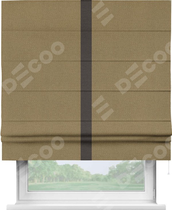 Римская штора производителя «Cortin», используется для проёма, пошита из ткани лён димаут оливковый, артикул 16243. Отделка шторы кантом «Хайвэй», ткань для канта используется из льна димаут разной расцветки на выбор. Имеет универсальный механизм и подходит для монтажа: на потолок, на стену и в нишу.