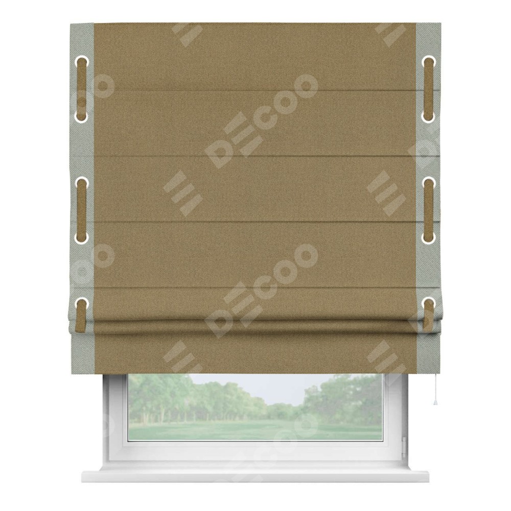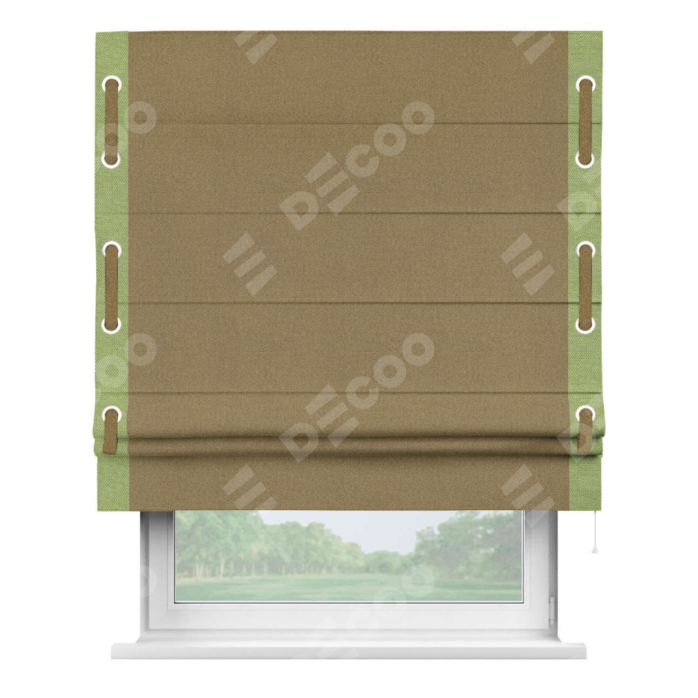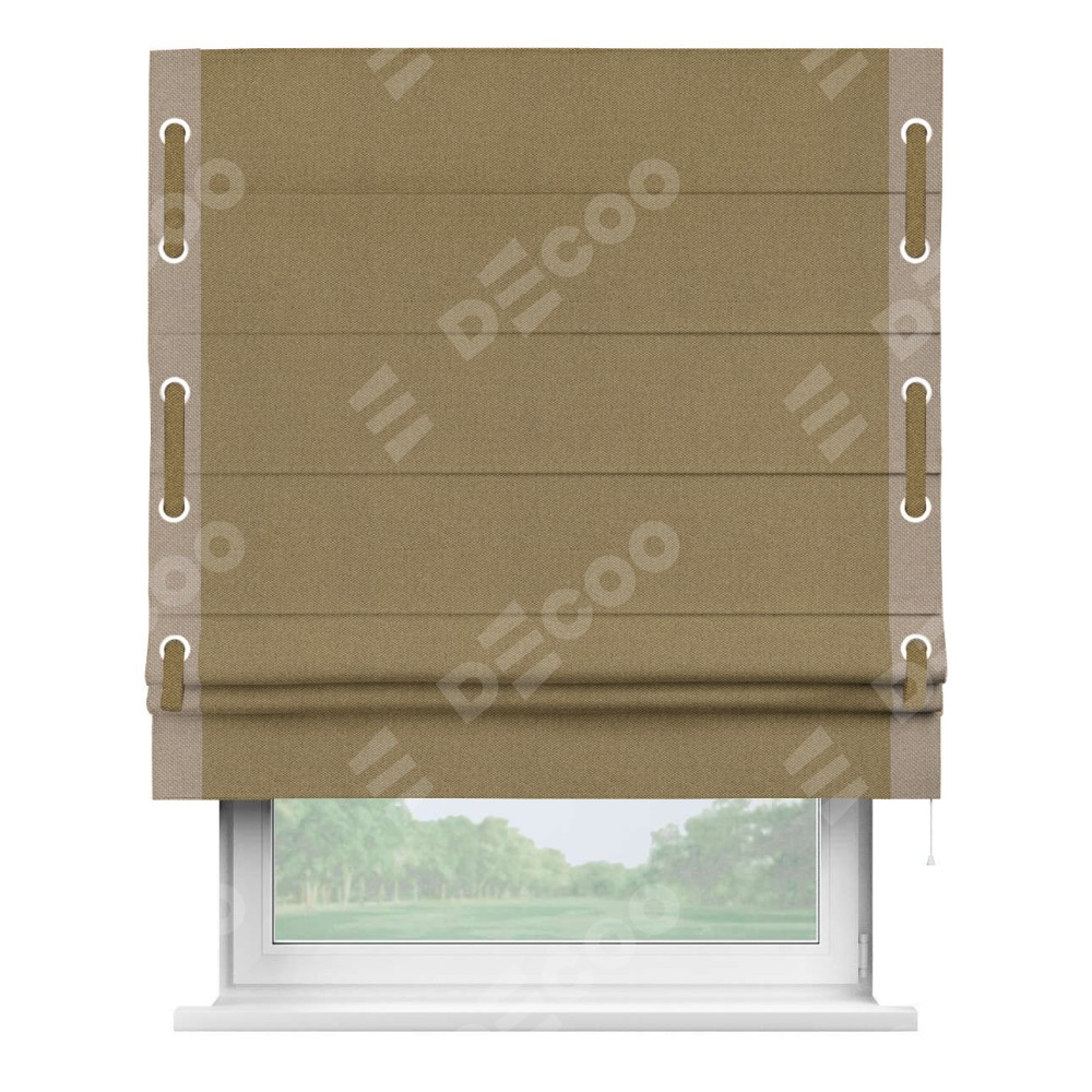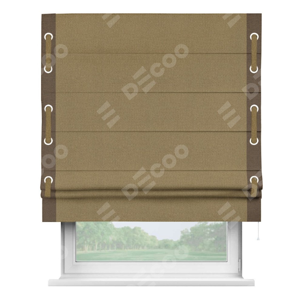 Римская штора производителя «Cortin», используется для проёма, пошита из ткани лён димаут оливковый, артикул 16243. Отделка шторы кантом «Стрим Дуо» на кантах расположены люверсы с пояском, ткань для канта используется лён димаут разной расцветки на выбор. Ткань для пояска обычно используется из основной ткани шторы, а так же можно сделать из любой расцветки по желанию. Имеет универсальный механизм и подходит для монтажа: на потолок, на стену и в нишу.
