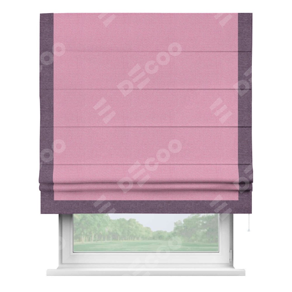 Римская штора производителя «Cortin», используется для проёма, пошита из ткани лён димаут розовый, артикул 16257. Отделка шторы кантом «Виктория», ткань для канта используется из льна димаут разной расцветки на выбор. Имеет универсальный механизм и подходит для монтажа: на потолок, на стену и в нишу.