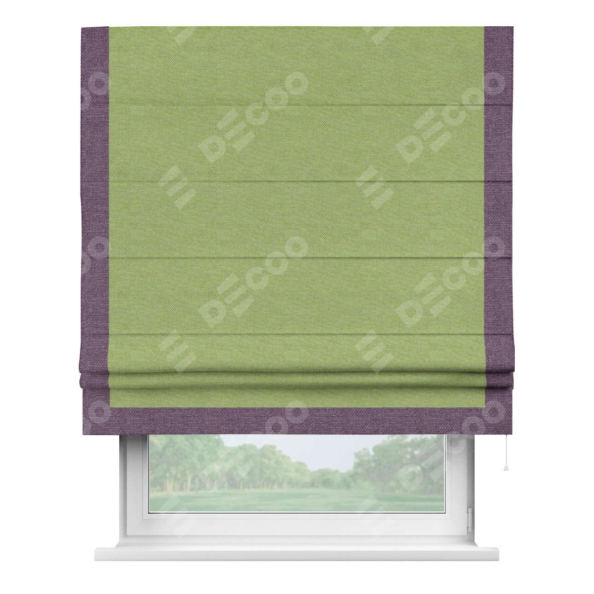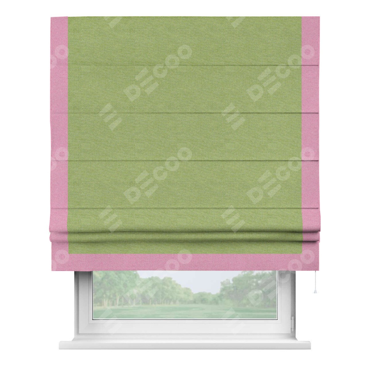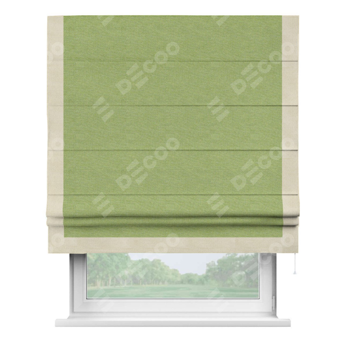 Римская штора производителя «Cortin», используется для проёма, пошита из ткани лён димаут салатовый, артикул 83032. Отделка шторы кантом «Виктория», ткань для канта используется из льна димаут разной расцветки на выбор. Имеет универсальный механизм и подходит для монтажа: на потолок, на стену и в нишу.