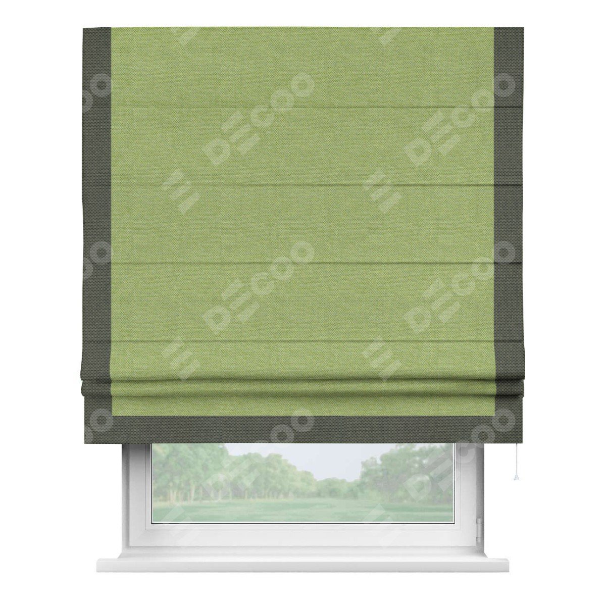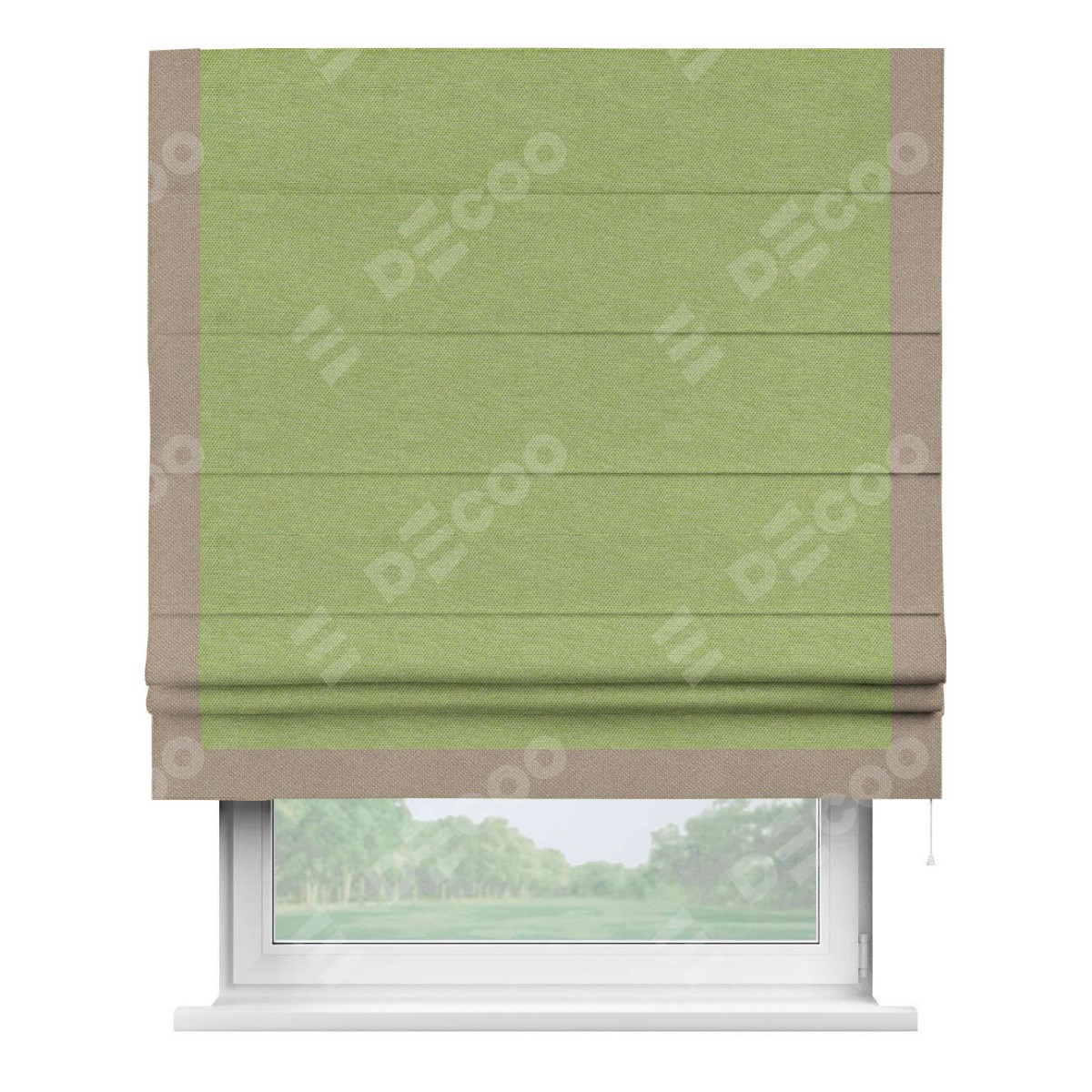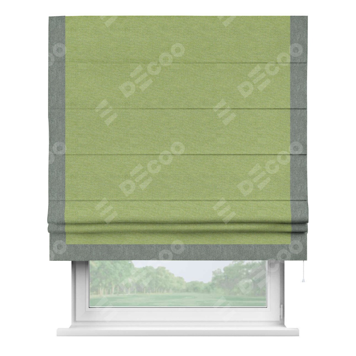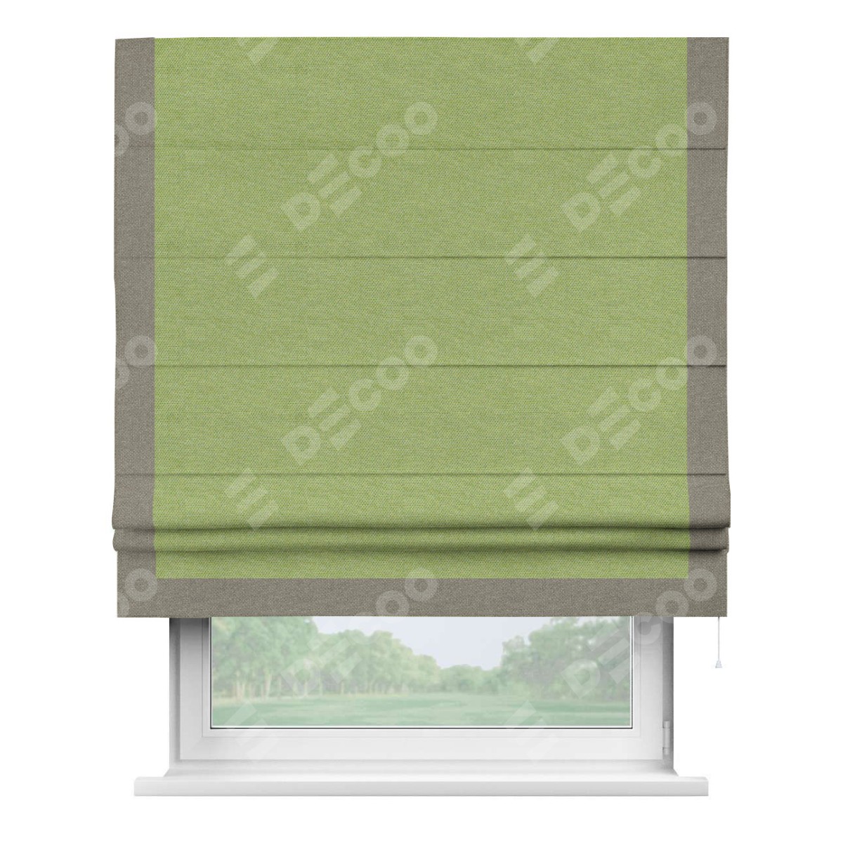 Римская штора производителя «Cortin», используется для проёма, пошита из ткани лён димаут салатовый, артикул 83032. Отделка шторы кантом «Виктория», ткань для канта используется из льна димаут разной расцветки на выбор. Имеет универсальный механизм и подходит для монтажа: на потолок, на стену и в нишу.