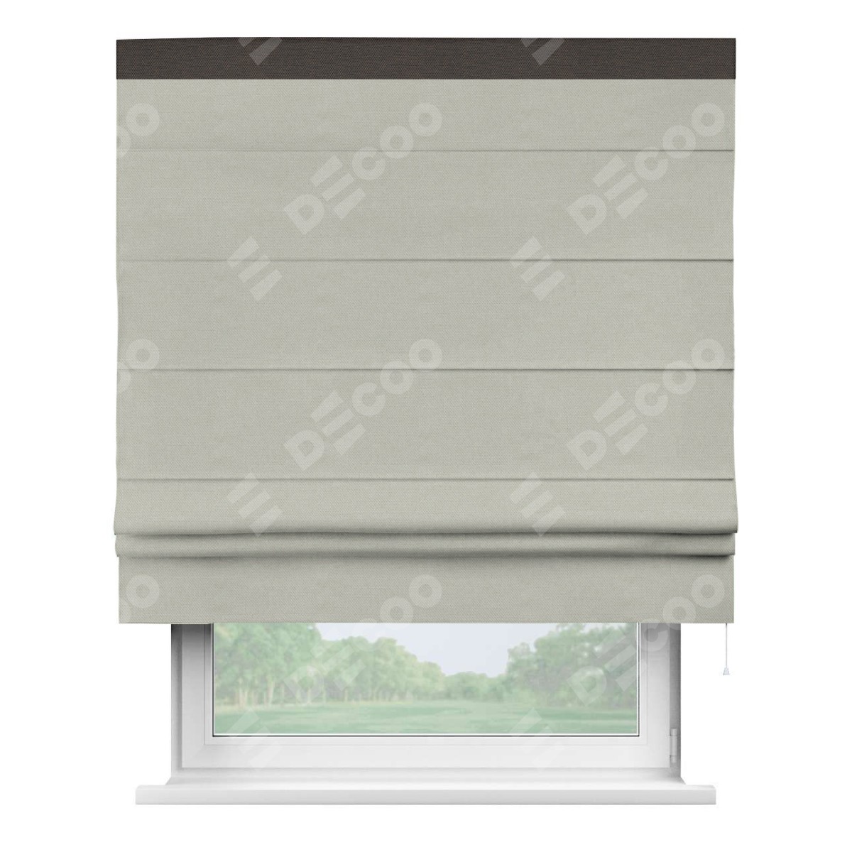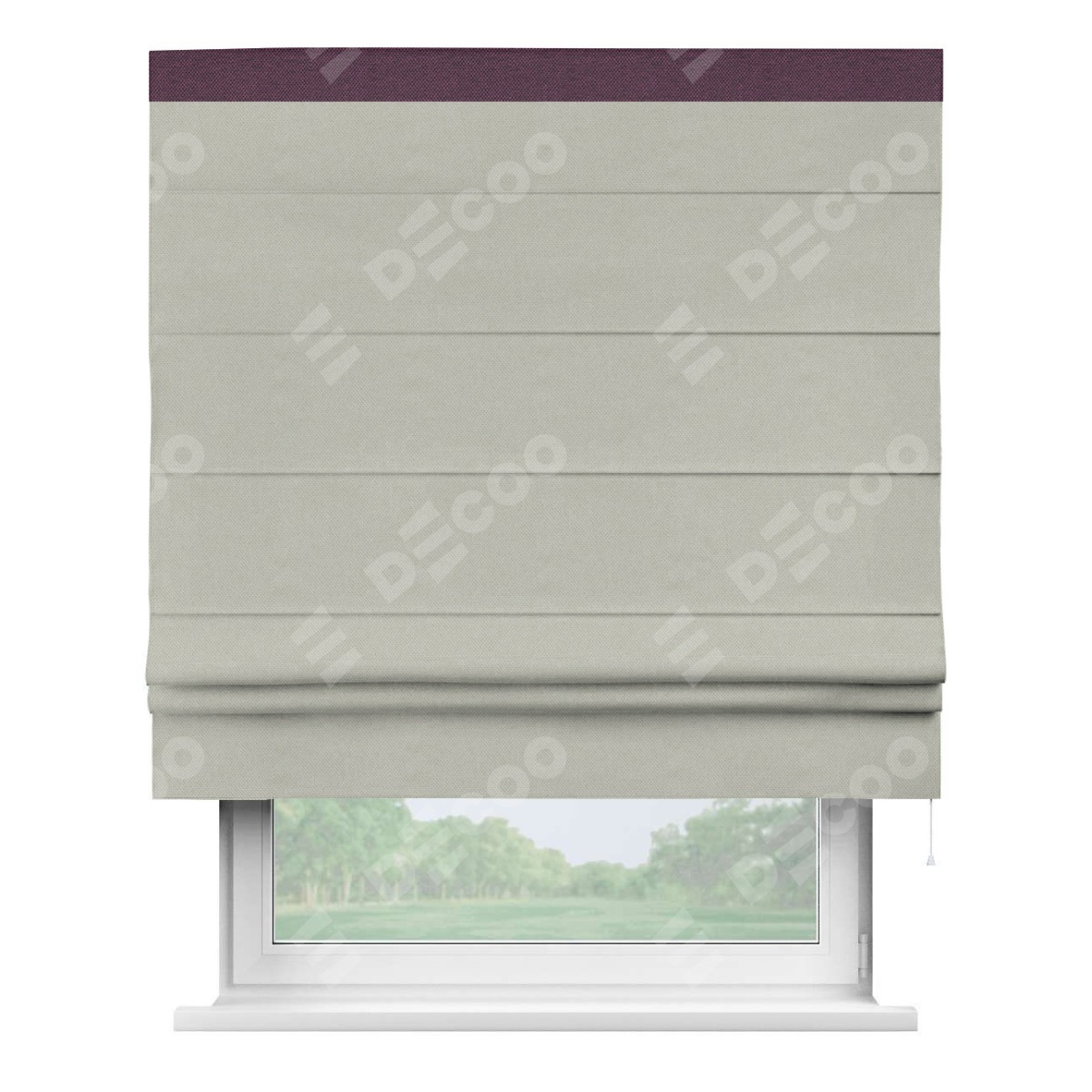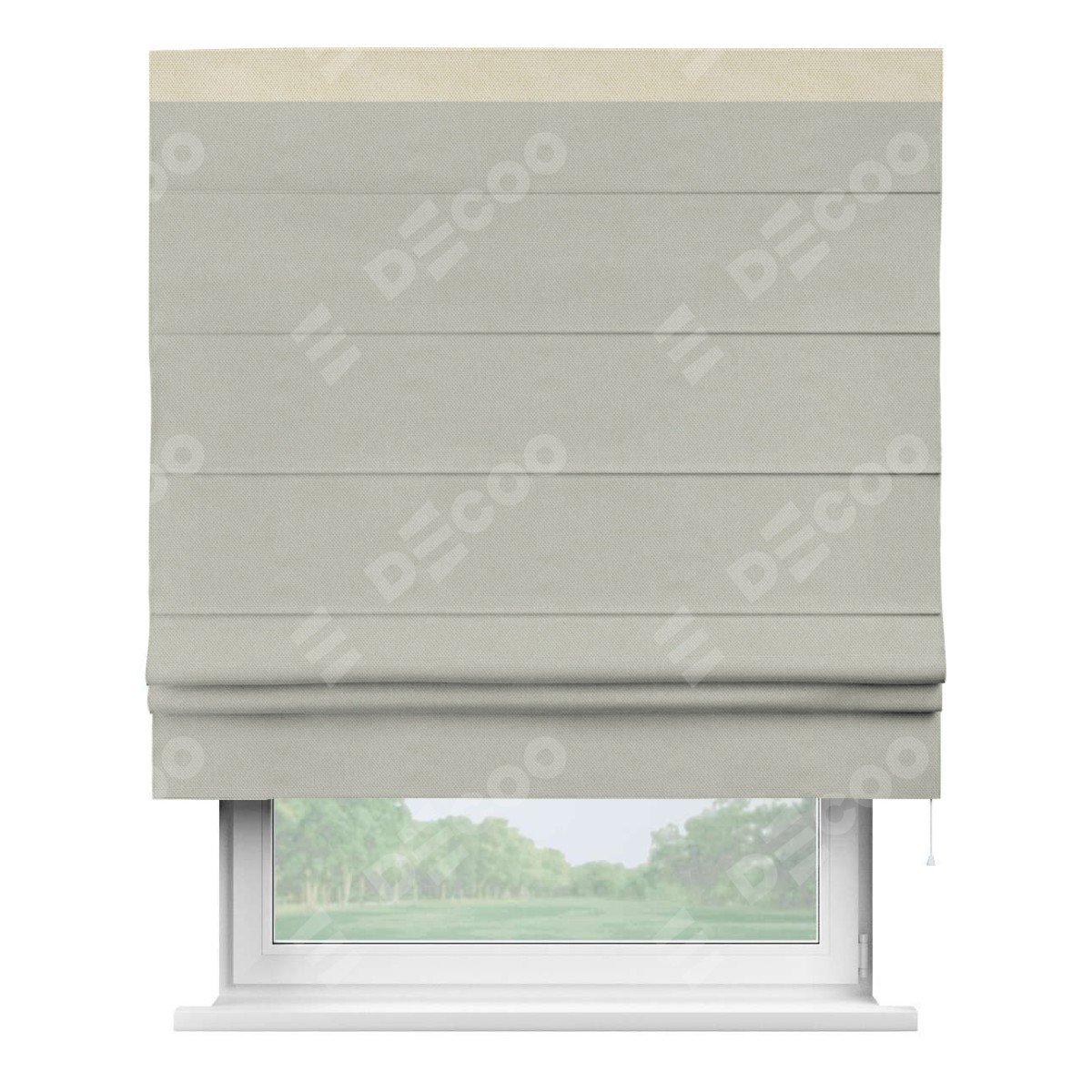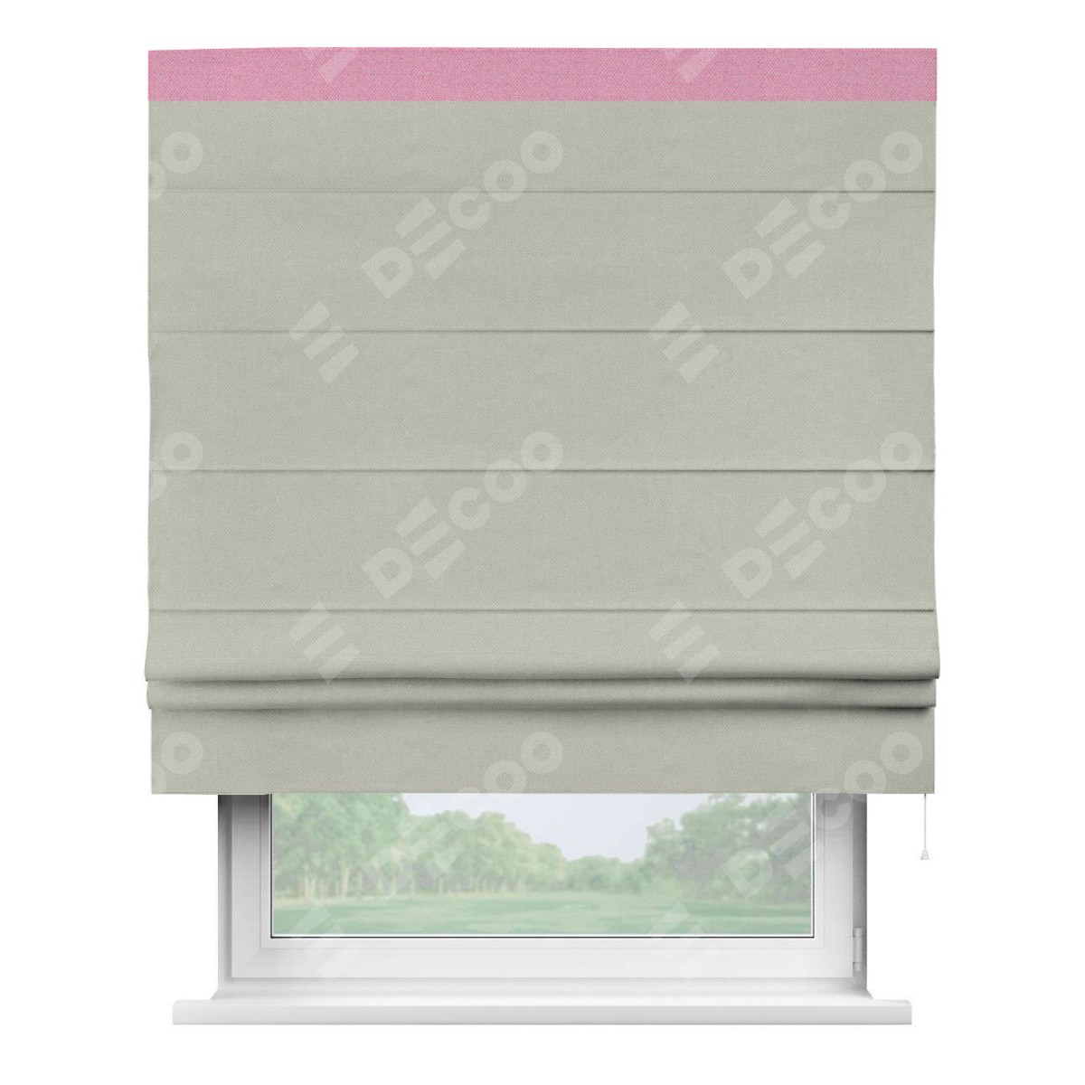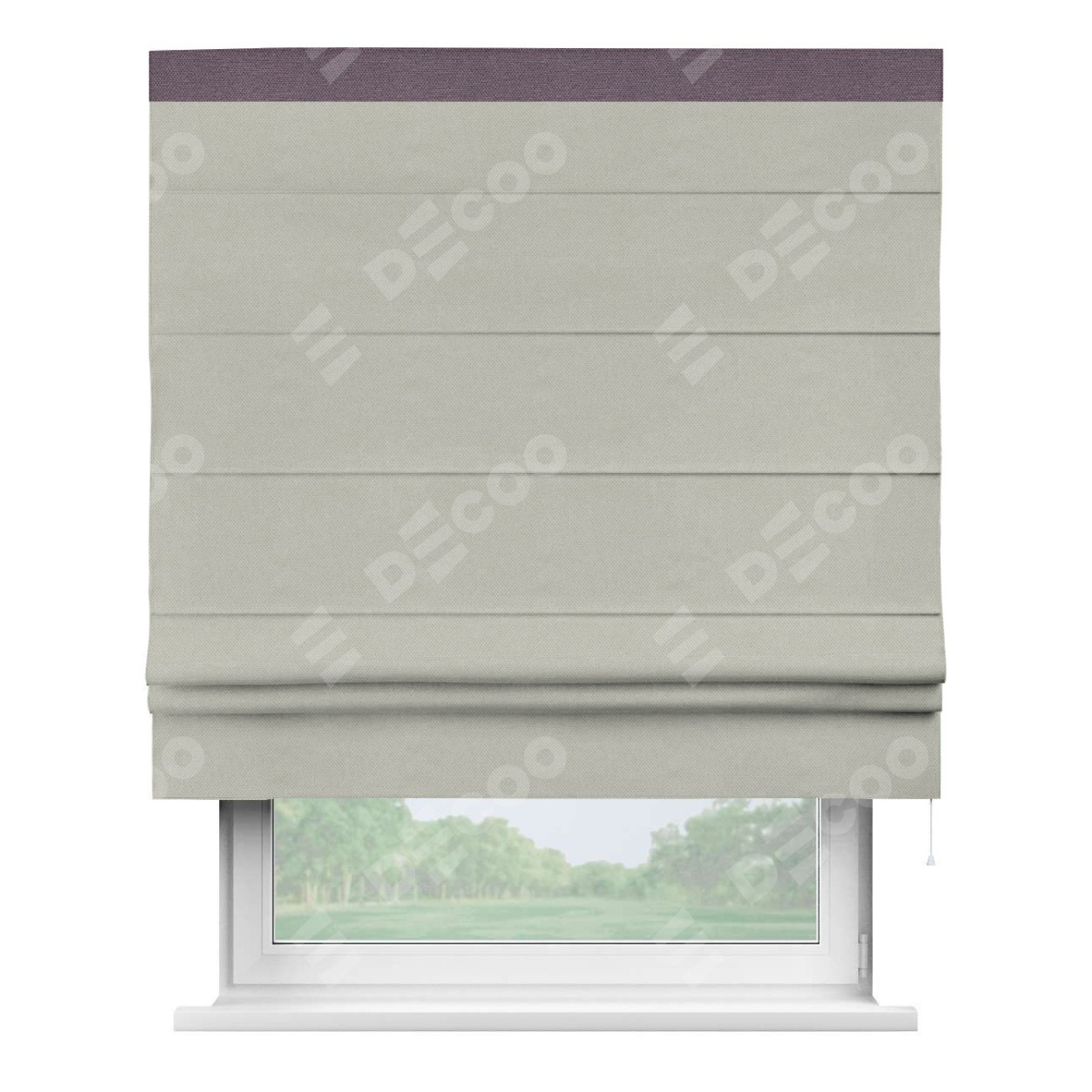 Римская штора производителя «Cortin», используется для проёма, пошита из ткани лён димаут светло-серый, артикул 83025. Отделка шторы кантом «Кинг», ткань для канта используется из льна димаут разной расцветки на выбор. Имеет универсальный механизм и подходит для монтажа: на потолок, на стену и в нишу.