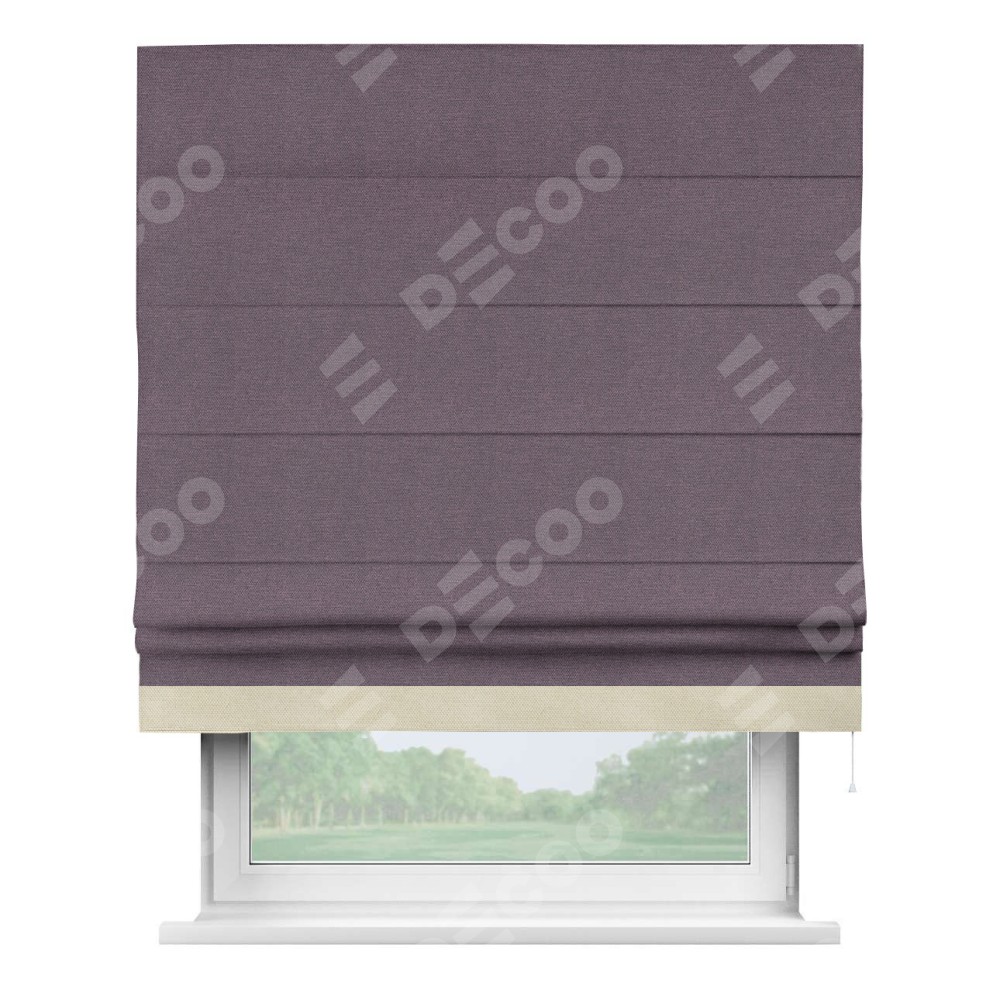 Римская штора производителя «Cortin», используется для проёма, пошита из ткани лён димаут светло-фиолетовый, артикул 83034. Отделка шторы кантом «Джестер», ткань для канта используется из льна димаут разной расцветки на выбор. Имеет универсальный механизм и подходит для монтажа: на потолок, на стену и в нишу.