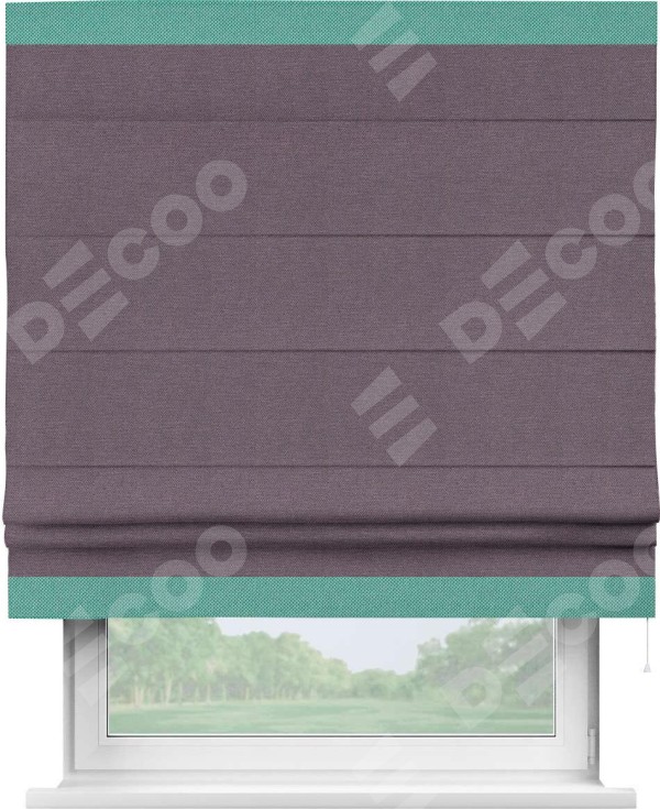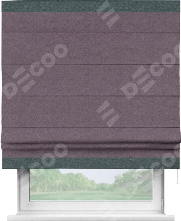 Римская штора производителя «Cortin», используется для проёма, пошита из ткани лён димаут светло-фиолетовый, артикул 83034. Отделка шторы кантом «Горизонт», ткань для канта используется из льна димаут разной расцветки на выбор. Имеет универсальный механизм и подходит для монтажа: на потолок, на стену и в нишу.