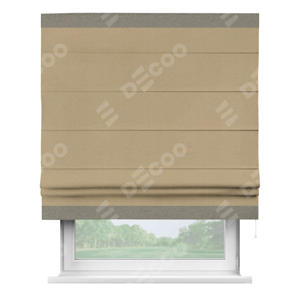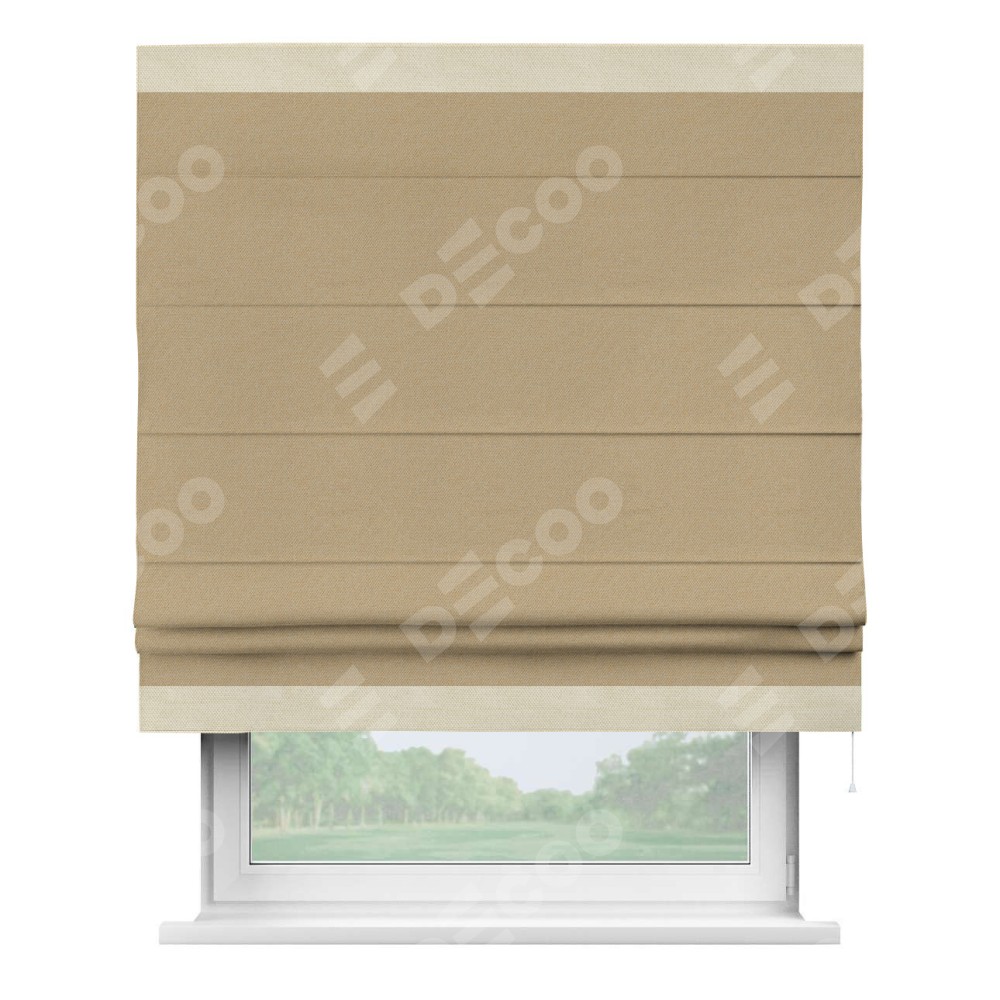 Римская штора производителя «Cortin», используется для проёма, пошита из ткани лён димаут тёмно-бежевый, артикул 83037. Отделка шторы кантом «Горизонт», ткань для канта используется из льна димаут разной расцветки на выбор. Имеет универсальный механизм и подходит для монтажа: на потолок, на стену и в нишу.