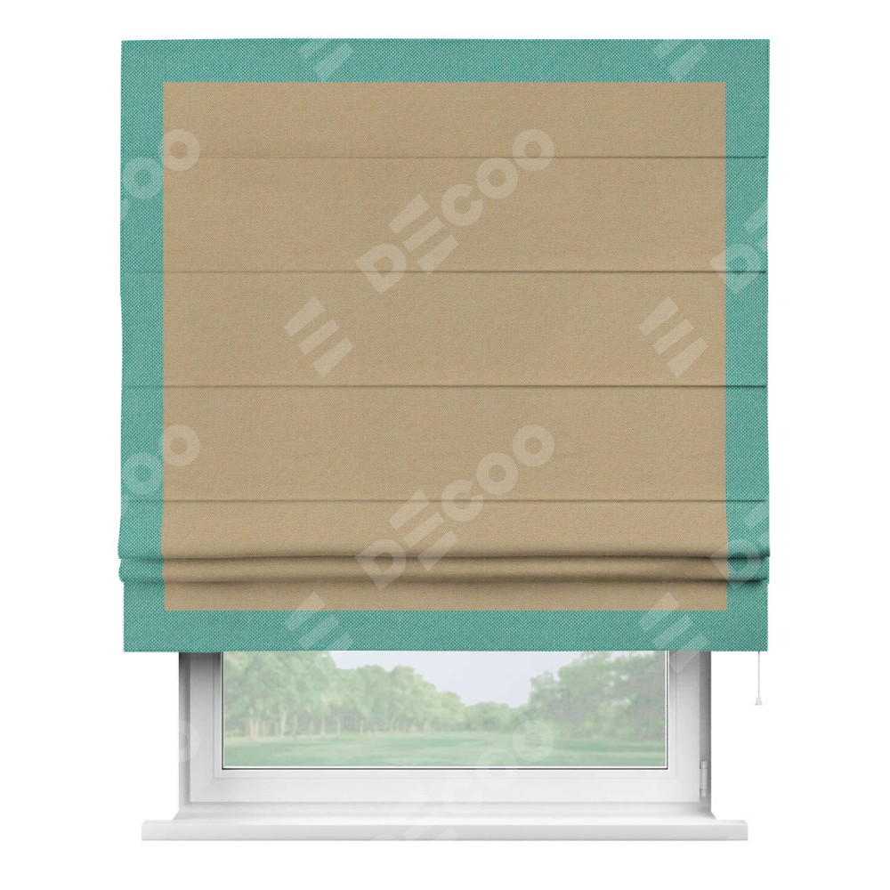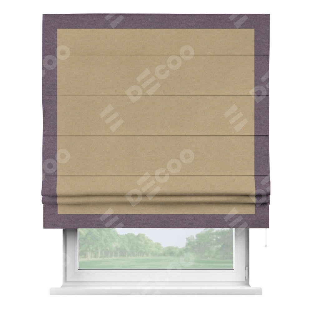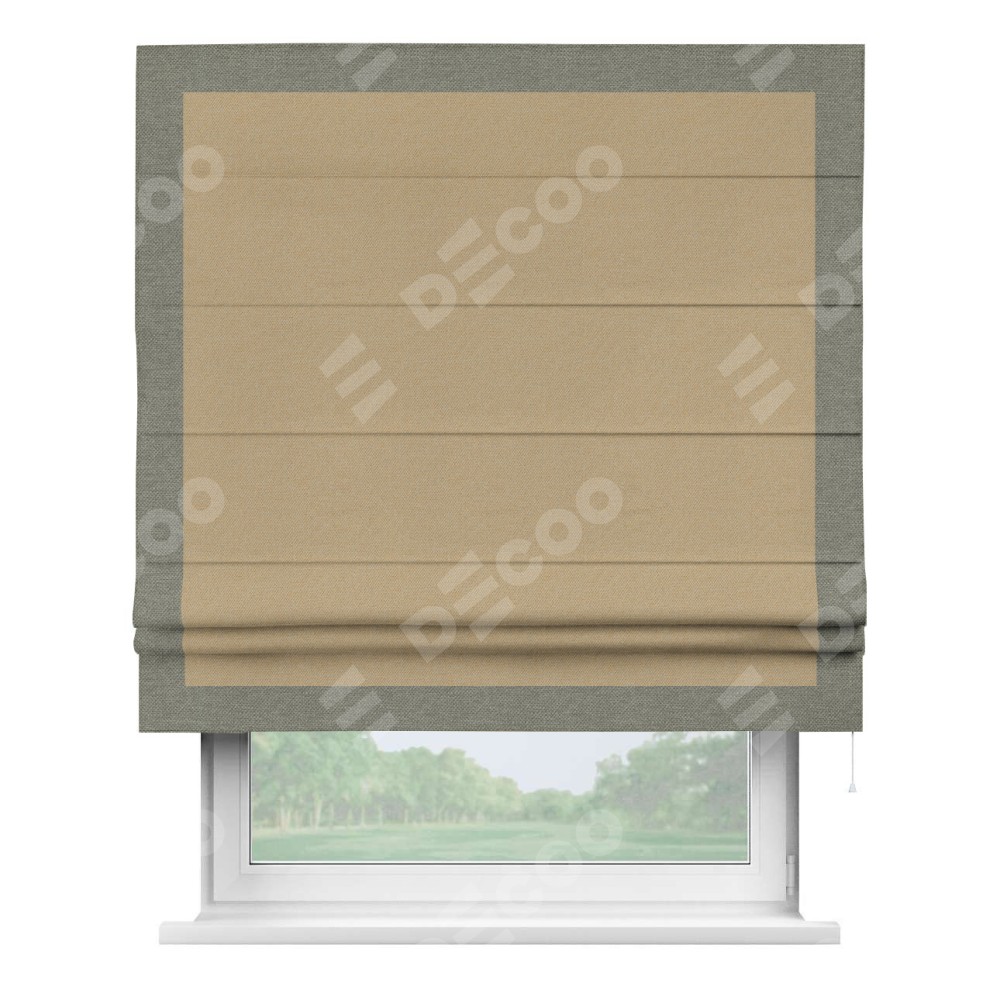 Римская штора производителя «Cortin», используется для проёма, пошита из ткани лён димаут тёмно-бежевый, артикул 83037. Отделка шторы кантом «Чесс», ткань для канта используется из льна димаут разной расцветки на выбор. Имеет универсальный механизм и подходит для монтажа: на потолок, на стену и в нишу.
