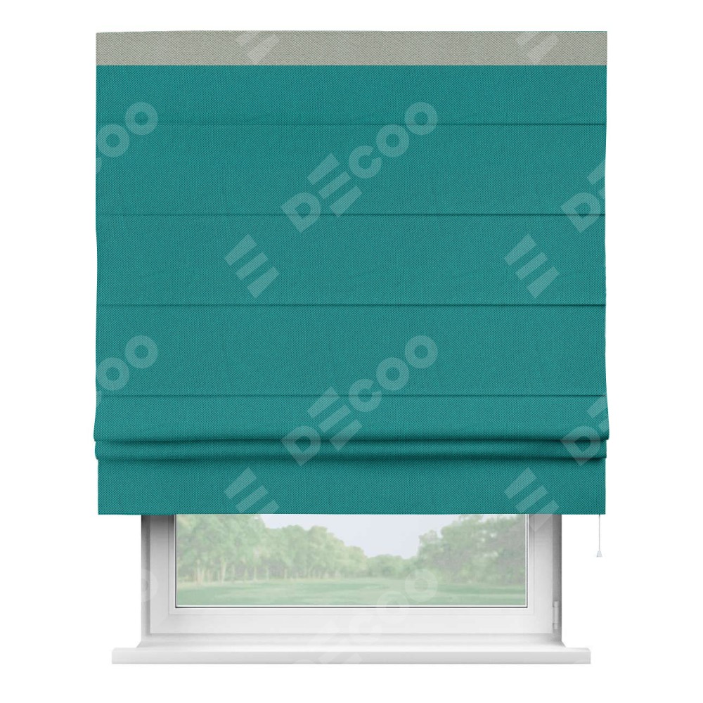 Римская штора производителя «Cortin», используется для проёма, пошита из ткани лён димаут тёмно-бирюзовый, артикул 318. Отделка шторы кантом «Кинг», ткань для канта используется из льна димаут разной расцветки на выбор. Имеет универсальный механизм и подходит для монтажа: на потолок, на стену и в нишу.