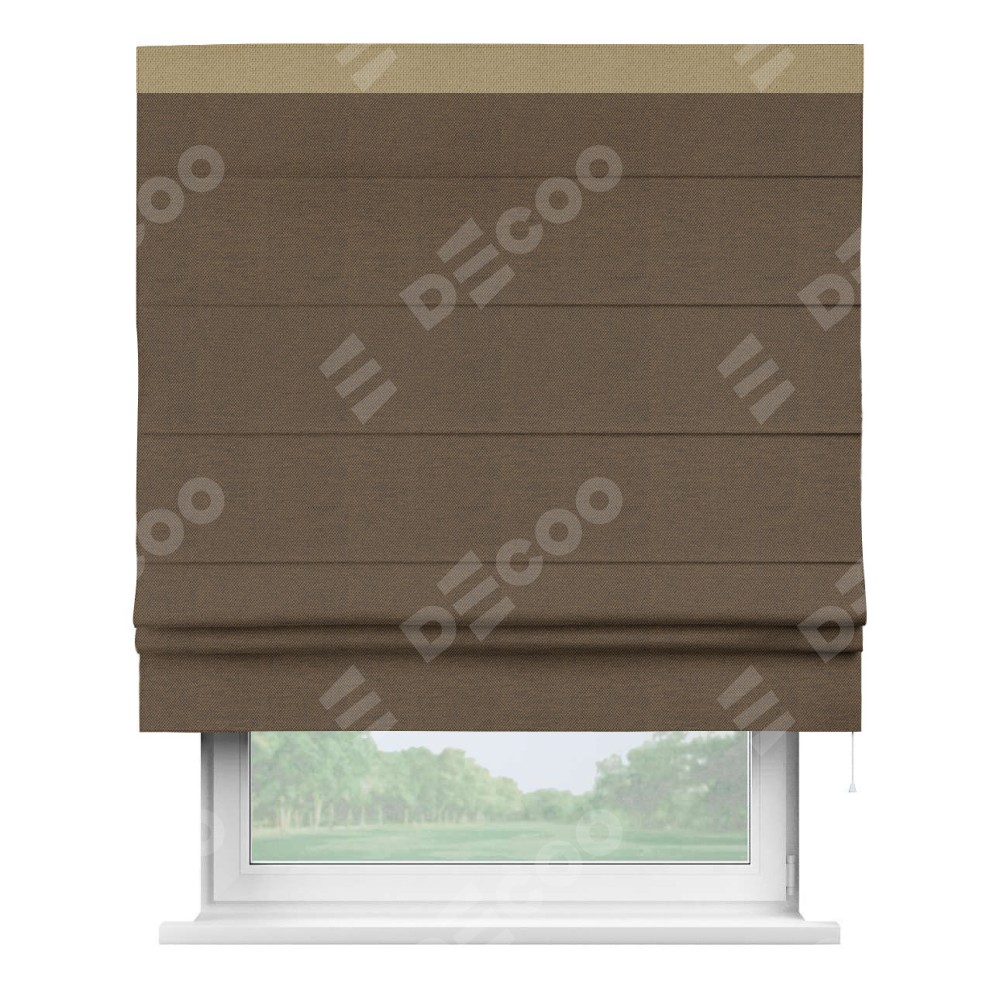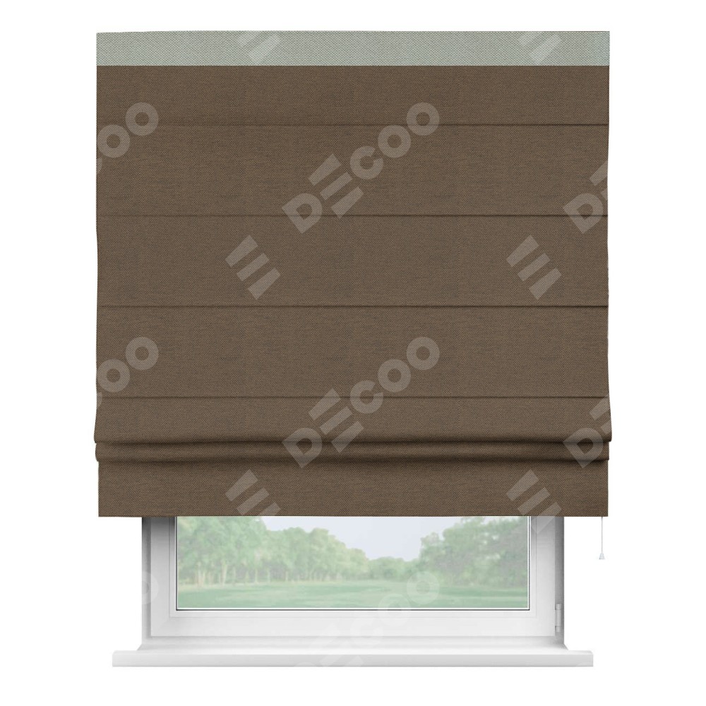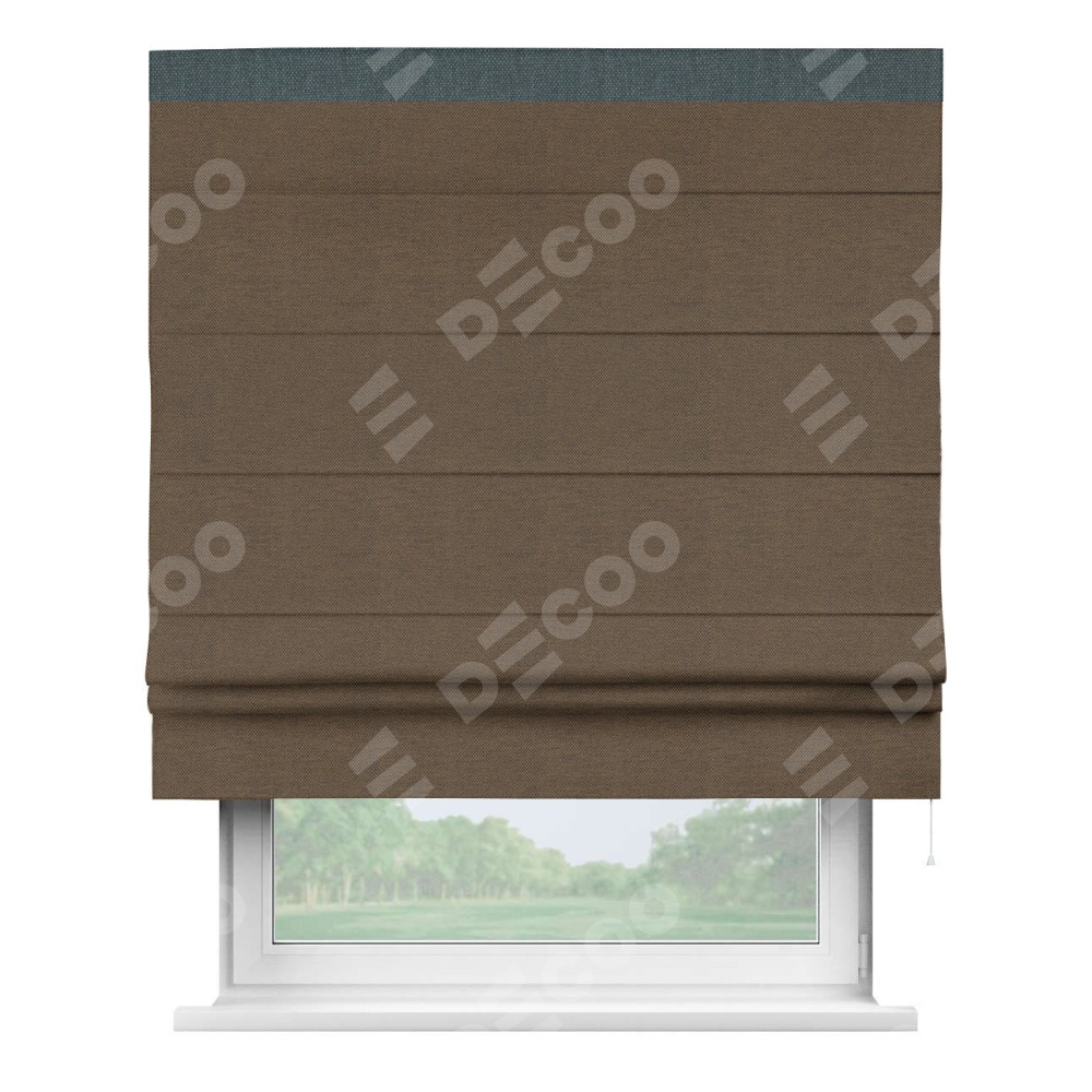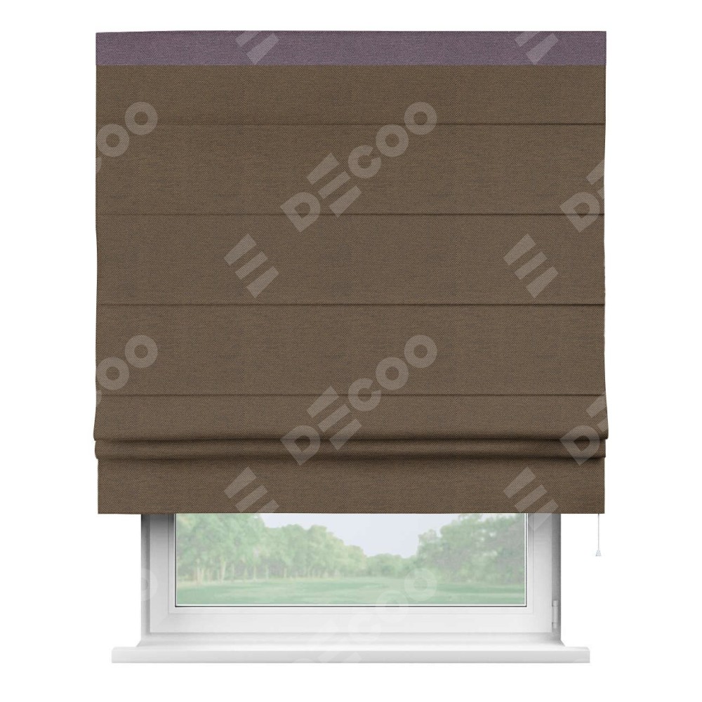 Римская штора производителя «Cortin», используется для проёма, пошита из ткани лён димаут тёмно-коричневый, артикул 83030. Отделка шторы кантом «Кинг», ткань для канта используется из льна димаут разной расцветки на выбор. Имеет универсальный механизм и подходит для монтажа: на потолок, на стену и в нишу.