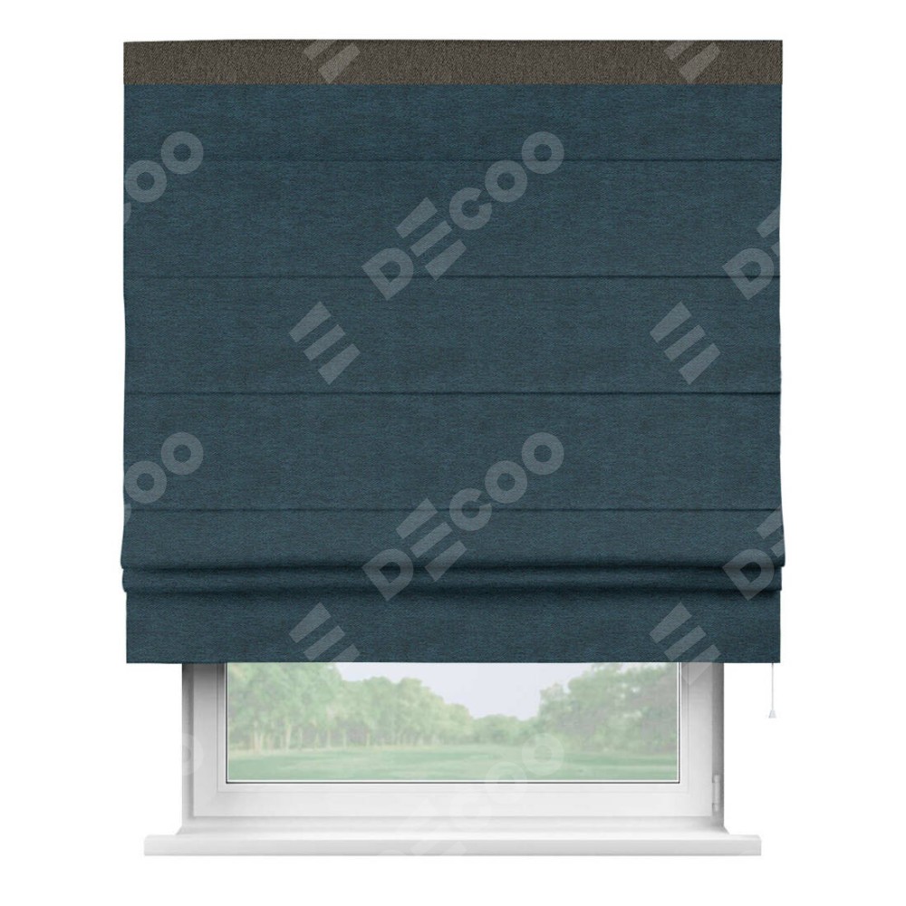 Римская штора производителя «Cortin», используется для проёма, пошита из ткани твид блэкаут глубокий синий, артикул 21590. Отделка шторы кантом «Кинг», ткань для канта используется из твида разной расцветки на выбор. Имеет универсальный механизм и подходит для монтажа: на потолок, на стену и в нишу.