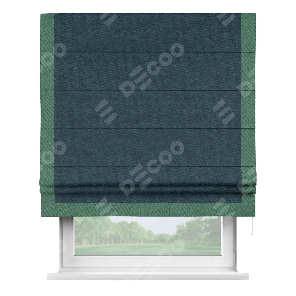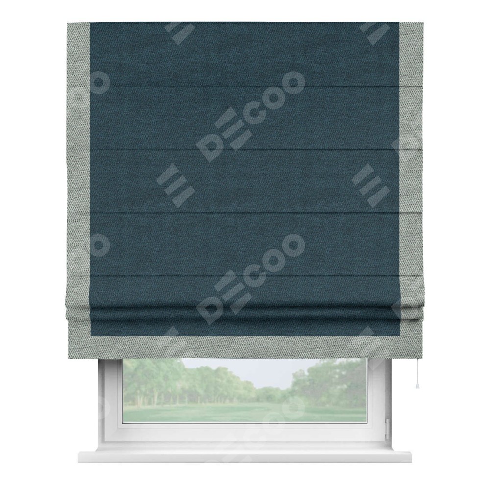 Римская штора производителя «Cortin», используется для проёма, пошита из ткани твид блэкаут глубокий синий, артикул 21590. Отделка шторы кантом «Виктория», ткань для канта используется из твида разной расцветки на выбор. Имеет универсальный механизм и подходит для монтажа: на потолок, на стену и в нишу.