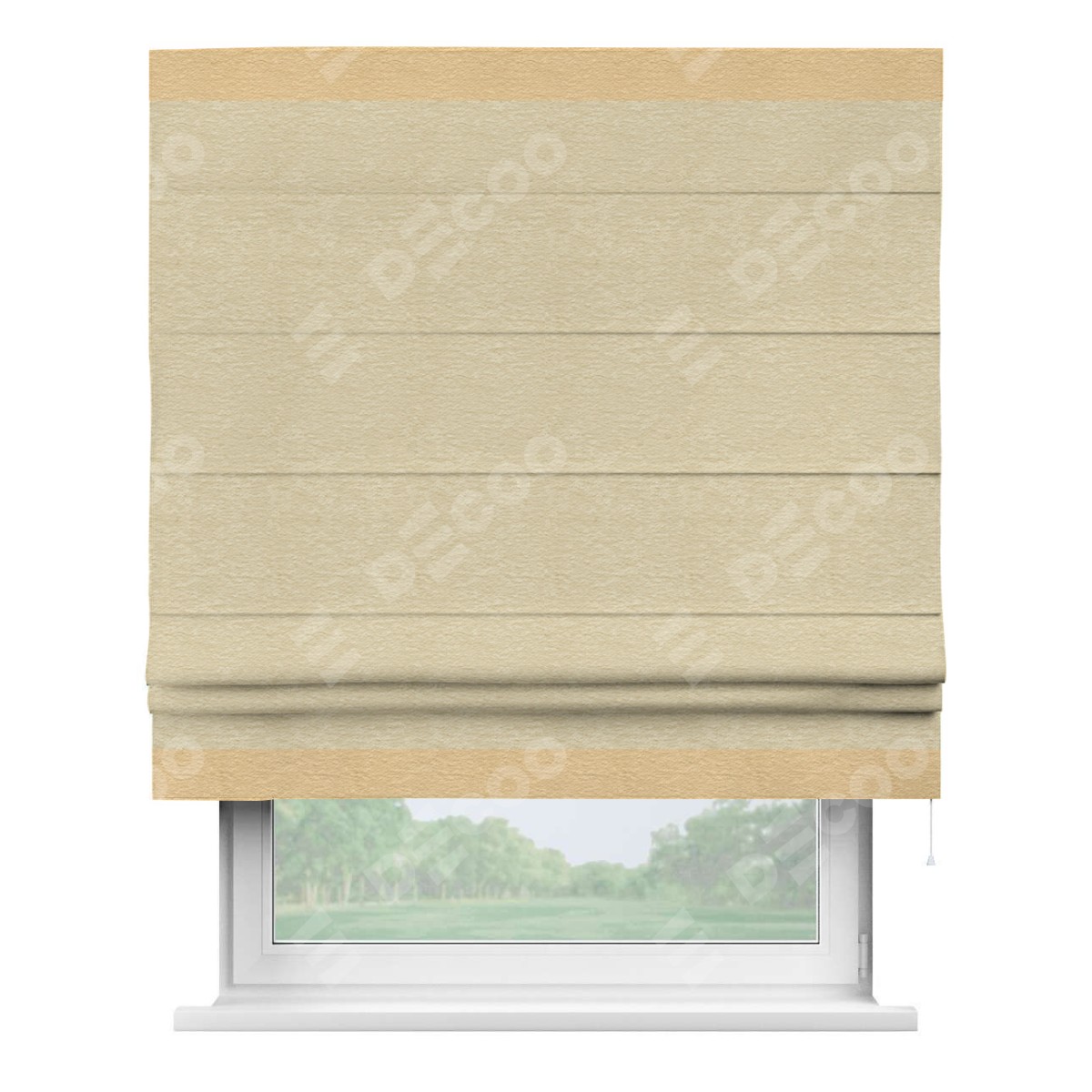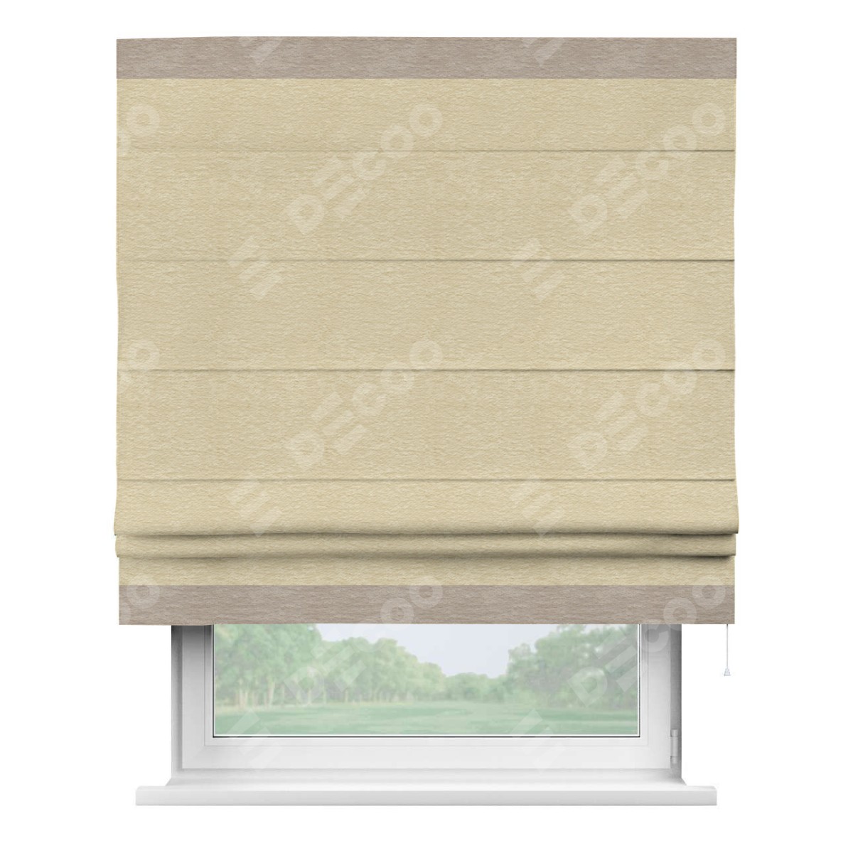 Римская штора производителя «Cortin», используется для проёма, пошита из ткани софт однотонный светло-бежевый, артикул 54426. Отделка шторы кантом «Горизонт», ткань для канта используется из софта разной расцветки на выбор. Имеет универсальный механизм и подходит для монтажа: на потолок, на стену и в нишу.