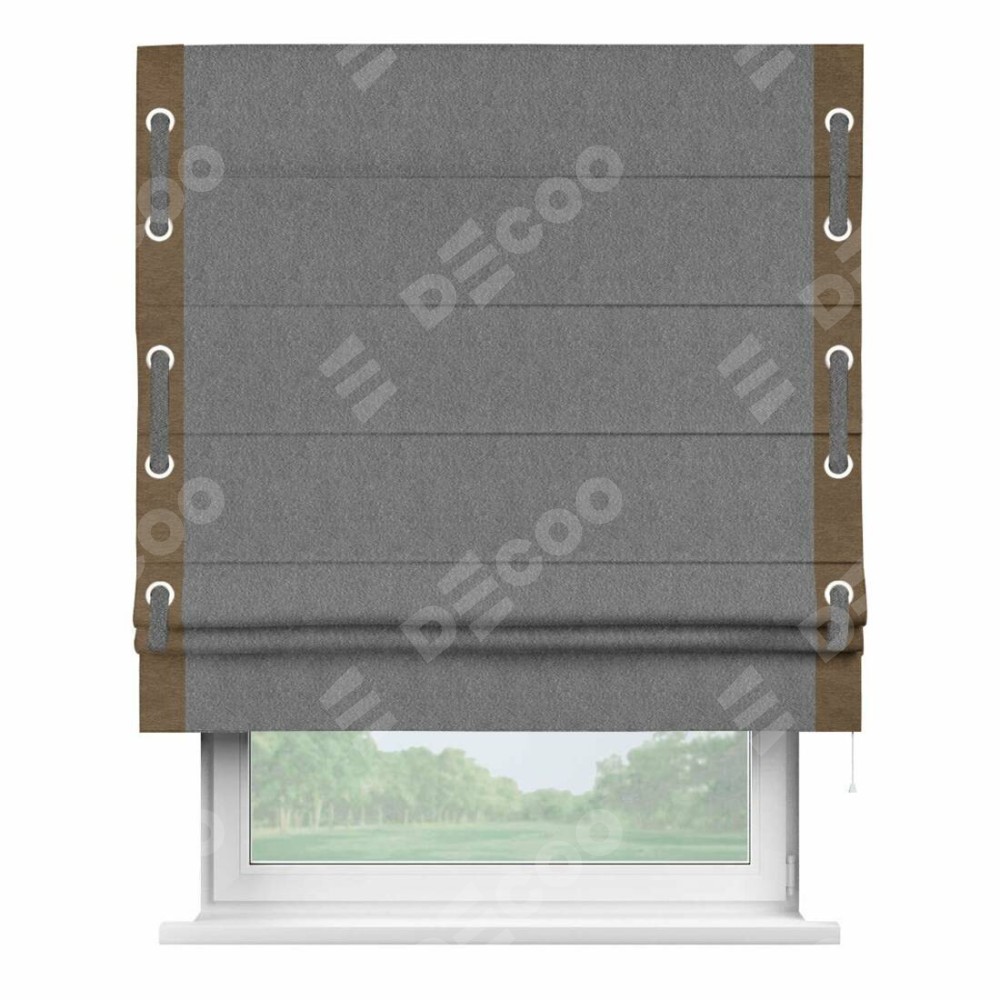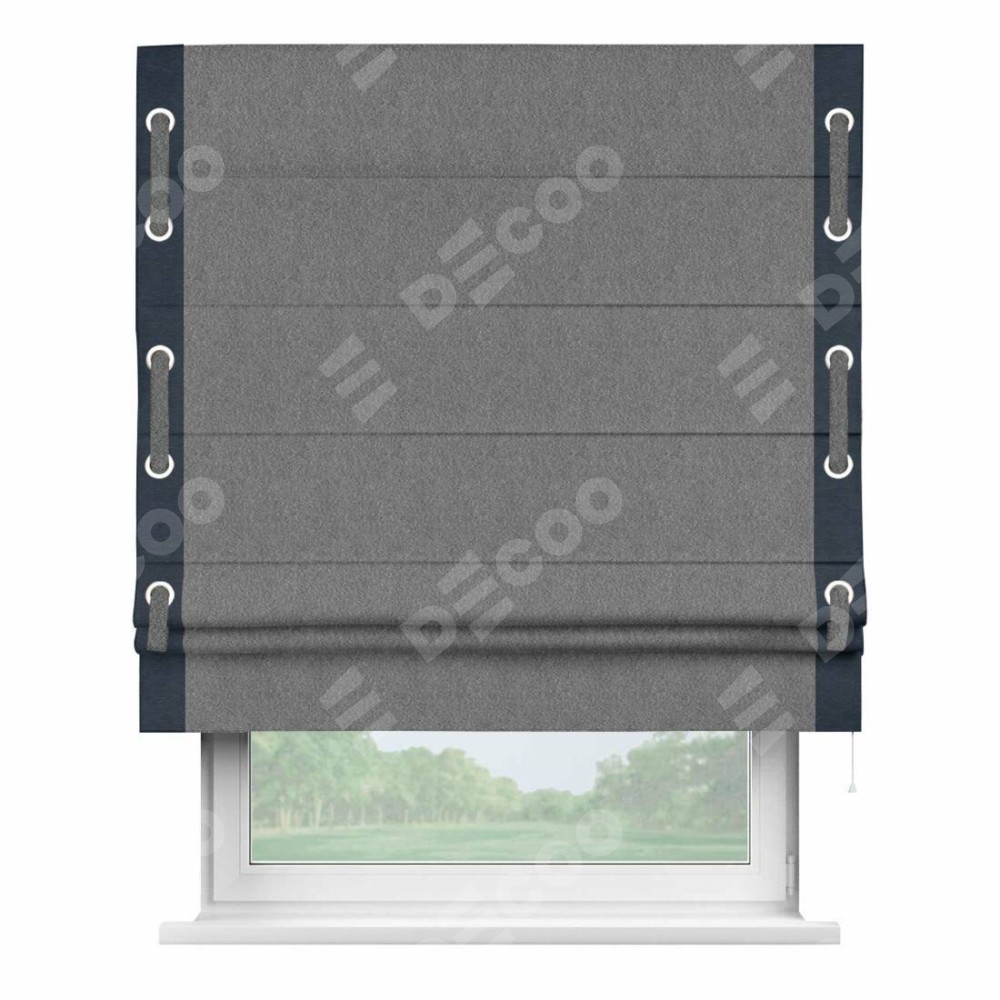 Римская штора производителя «Cortin», используется для проёма, пошита из ткани софт однотонный серый, артикул 70605. Отделка шторы кантом «Стрим Дуо» на кантах расположены люверсы с пояском, ткань для канта используется из софта разной расцветки на выбор. Ткань для пояска обычно используется из основной ткани шторы, а так же можно сделать из любой расцветки по желанию. Имеет универсальный механизм и подходит для монтажа: на потолок, на стену и в нишу.