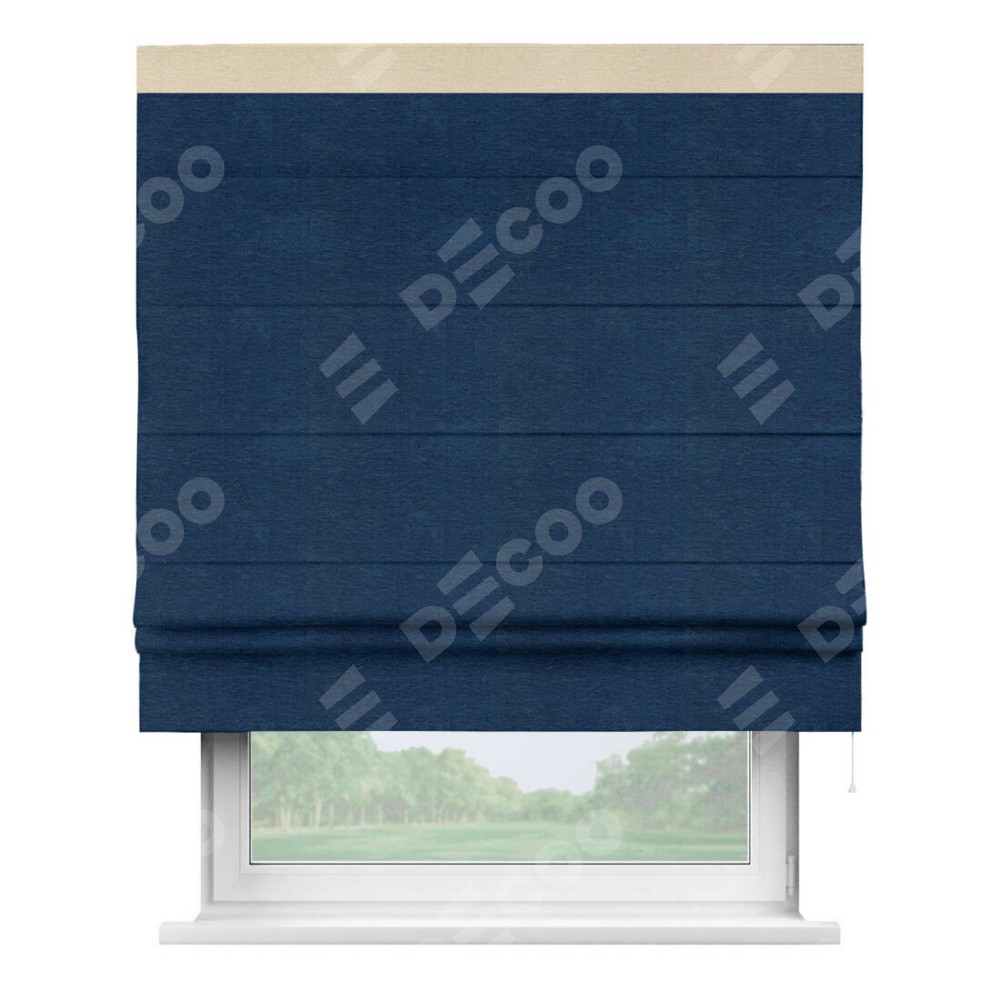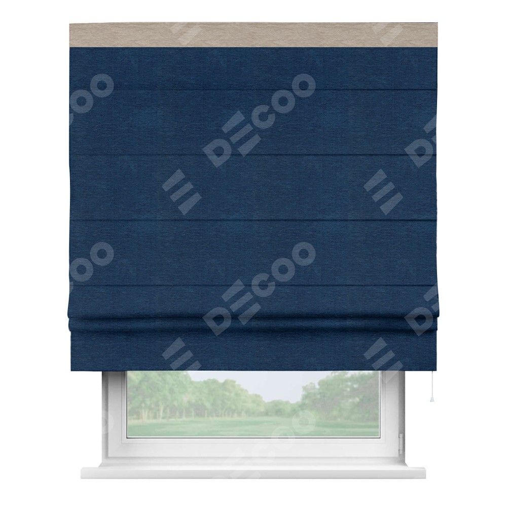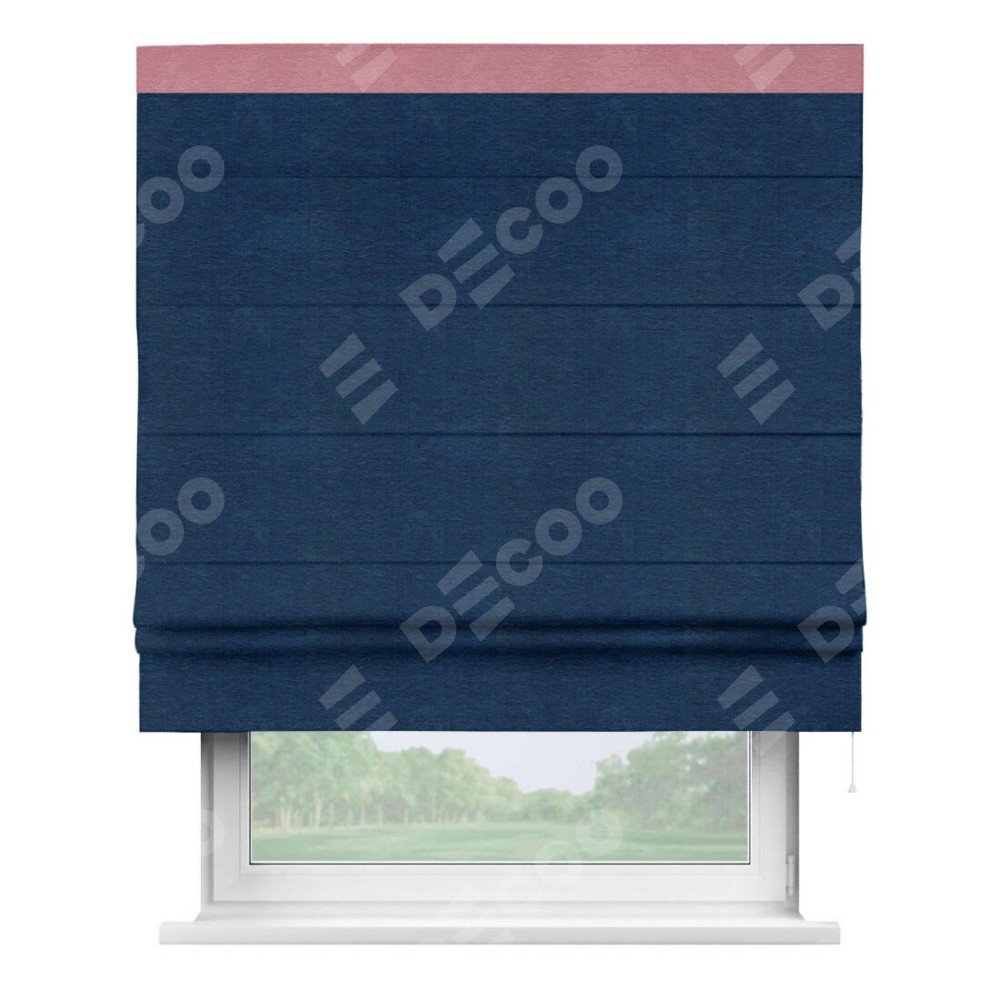 Римская штора производителя «Cortin», используется для проёма, пошита из ткани софт однотонный синий, артикул 42937. Отделка шторы кантом «Кинг», ткань для канта используется из софта разной расцветки на выбор. Имеет универсальный механизм и подходит для монтажа: на потолок, на стену и в нишу.