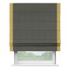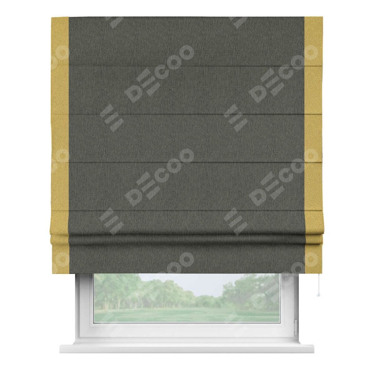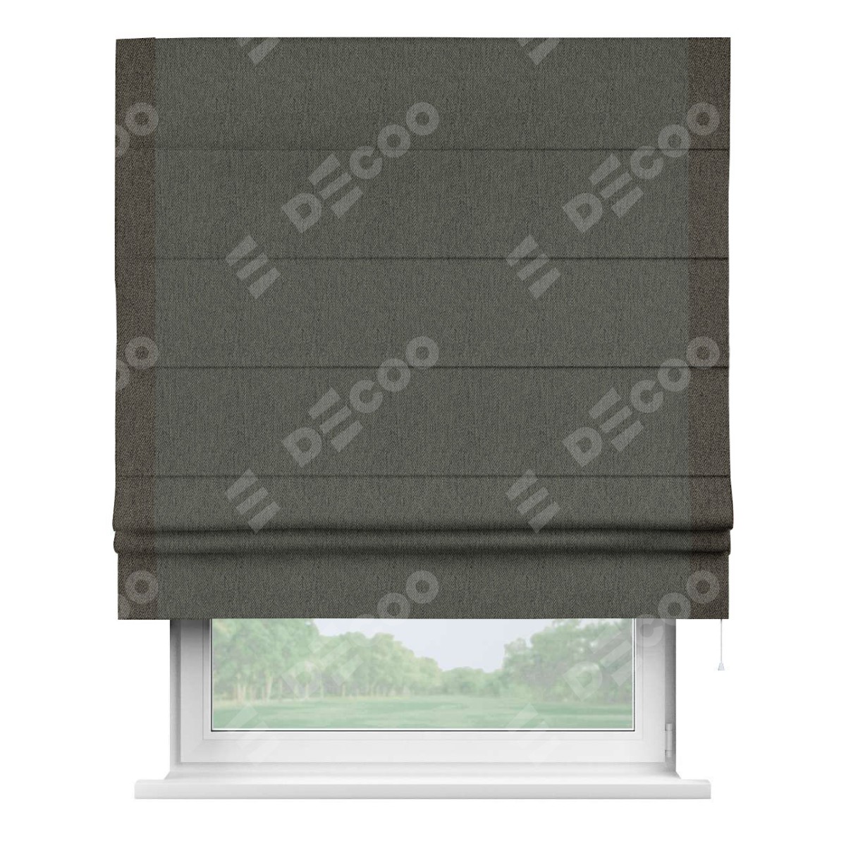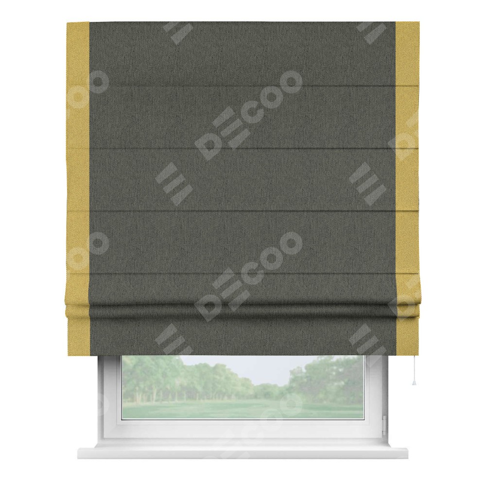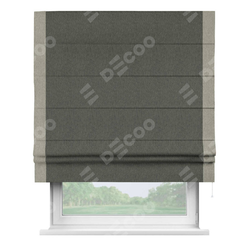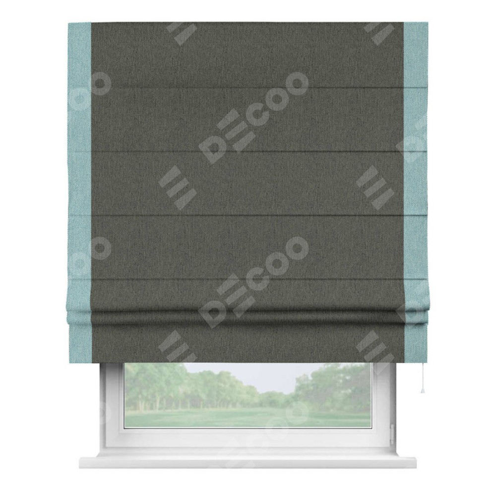 Римская штора производителя «Cortin», используется для проёма, пошита из ткани твид блэкаут тёмно-серый, артикул 21587. Отделка шторы кантом «Стрим Дуо», ткань для канта используется из твида разной расцветки на выбор. Имеет универсальный механизм и подходит для монтажа: на потолок, на стену и в нишу.