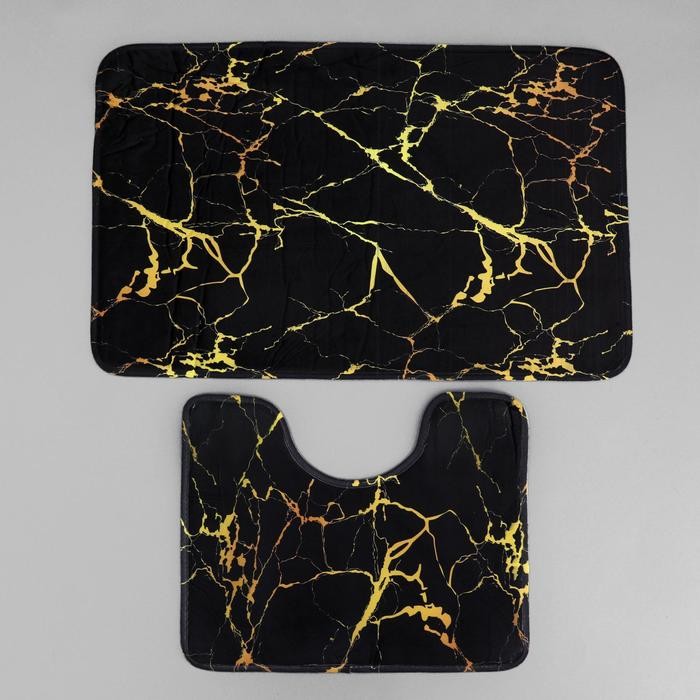 Набор ковриков для ванны и туалета Доляна «Мрамор», 2 шт: 79×50, 50×39 см, цвет чёрный
