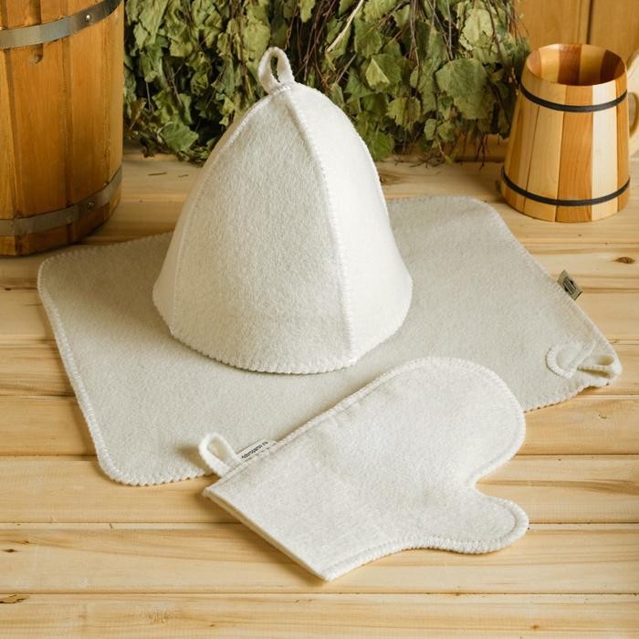 Для комфортного отдыха в парной возьмите с собой набор банных принадлежностей. Предметы из этого комплекта предохраняют тело от перегрева и являются средствами индивидуального пользования. Влажные изделия рекомендуется сушить в расправленном виде на горизонтальной поверхности. Принадлежности из войлока и фетра стирайте вручную при температуре воды 30 °C.